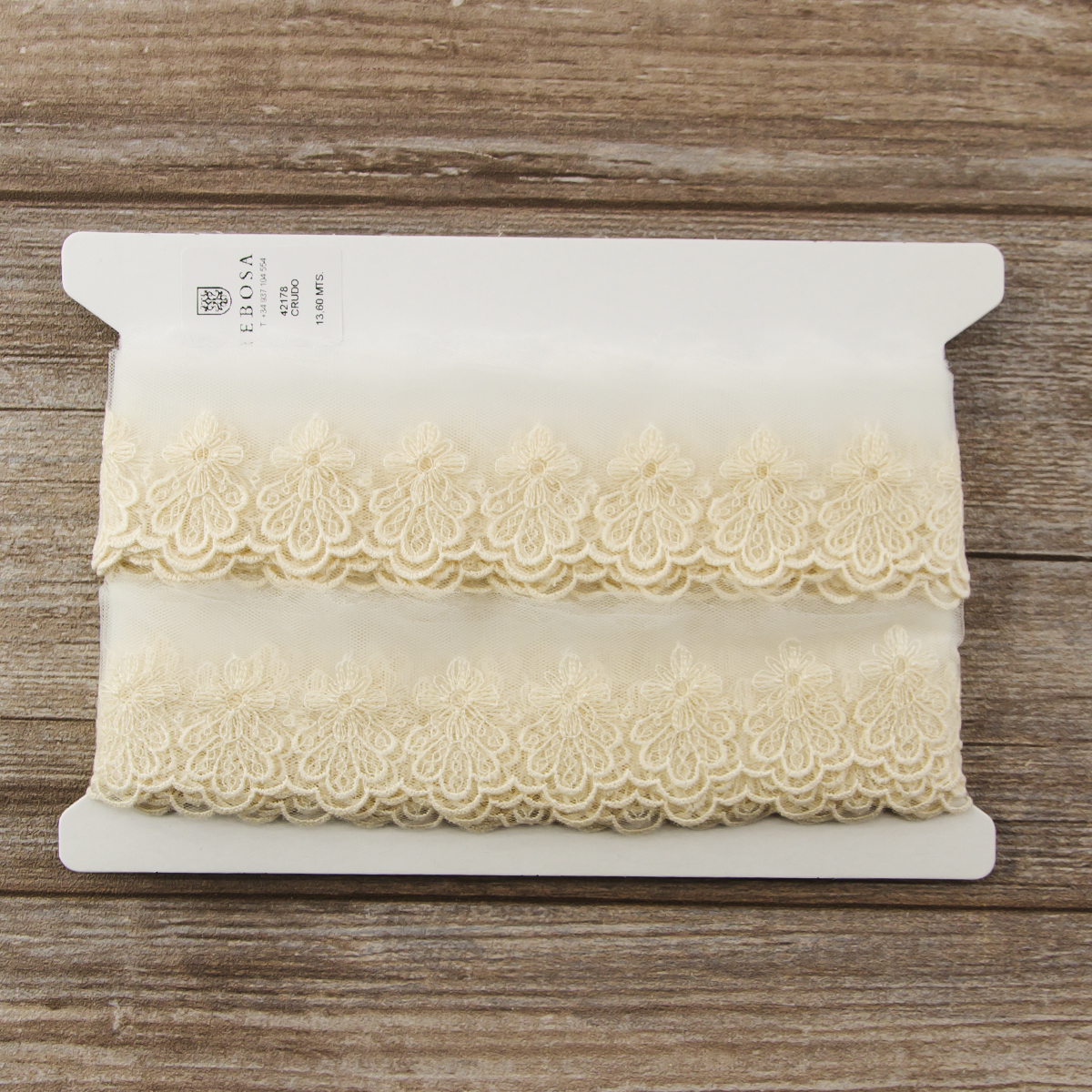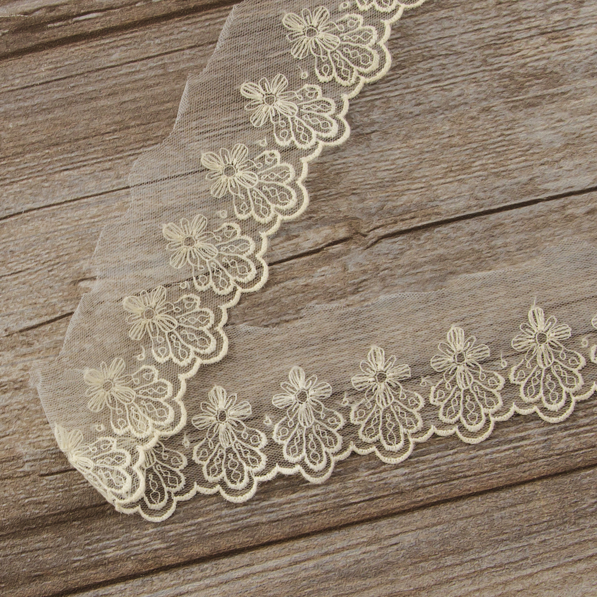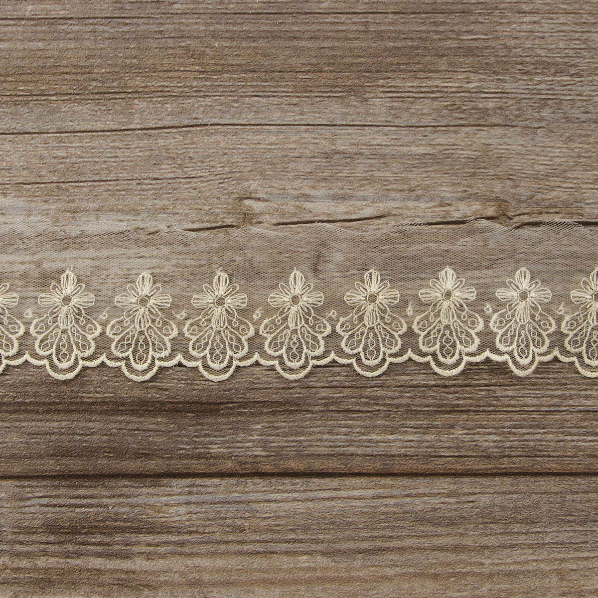 Вышивка выполнена матовыми полиэстеровыми нитями №110. Тюль-основа из 100% полиэстера белого цвета имеет запас на растяжимость, не дает стягивания швов, края не осыпаются. Применяется для отделки свадебных и нарядных женских платьев. Также применяется для отделки женских платьев, юбок и жакетов из легких и средней плотности тканей, например сукна и габардина; великолепно подходит для отделки женского белья и одежды из трикотажа; изысканно смотрится как отделка вязаных изделий. Кружево на тюле мягкое, удобно в носке и легкое в уходе, не мнется. Стирать в режиме деликатной стирки, сушить в расправленном виде, гладить с изнаночной стороны в 1 или 2 температурном режиме.