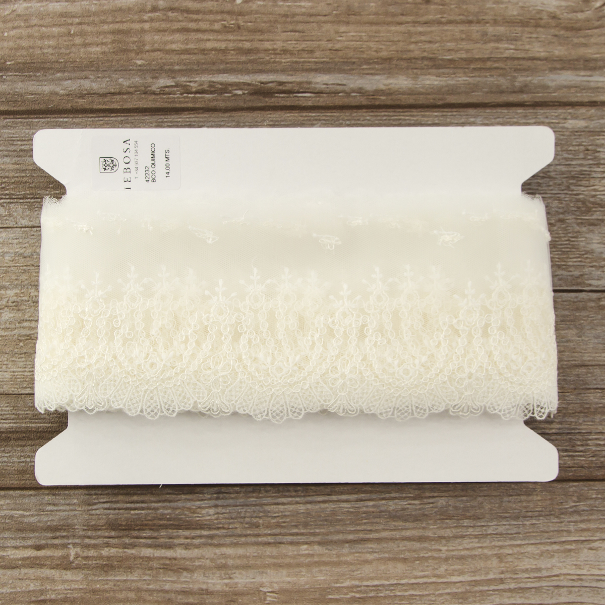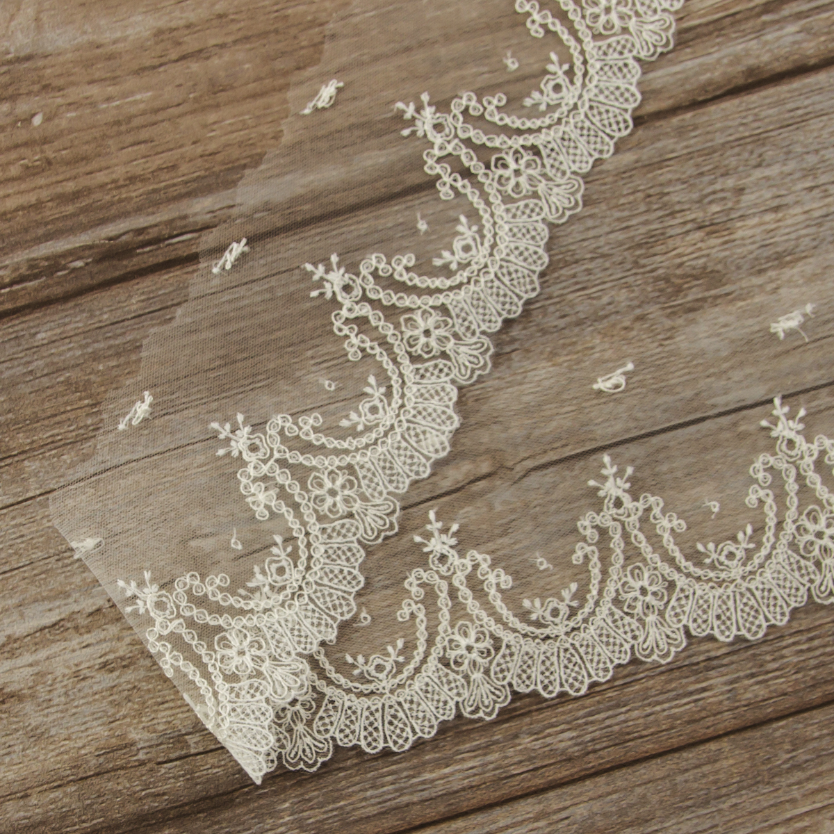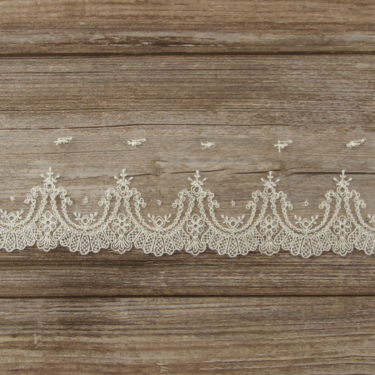 Вышивка выполнена матовыми полиэстеровыми нитями №110. Тюль-основа из 100% полиэстера белого цвета имеет запас на растяжимость, не дает стягивания швов, края не осыпаются. Применяется для отделки свадебных и нарядных женских платьев. Также применяется для отделки женских платьев, юбок и жакетов из легких и средней плотности тканей, например сукна и габардина; великолепно подходит для отделки женского белья и одежды из трикотажа; изысканно смотрится как отделка вязаных изделий. Кружево на тюле мягкое, удобно в носке и легкое в уходе, не мнется. Стирать в режиме деликатной стирки, сушить в расправленном виде, гладить с изнаночной стороны в 1 или 2 температурном режиме.