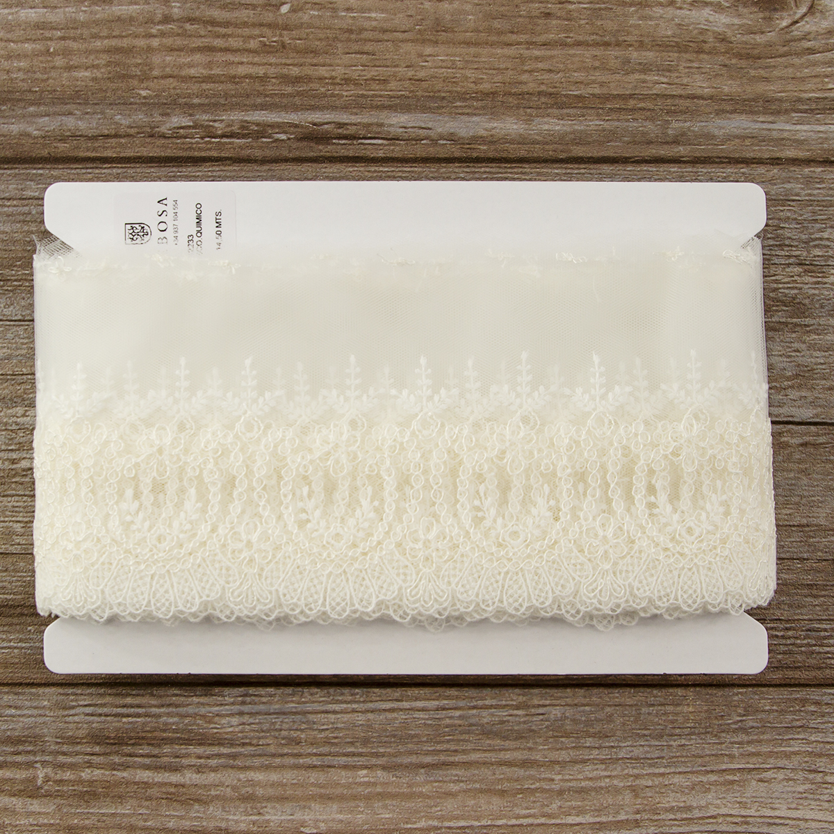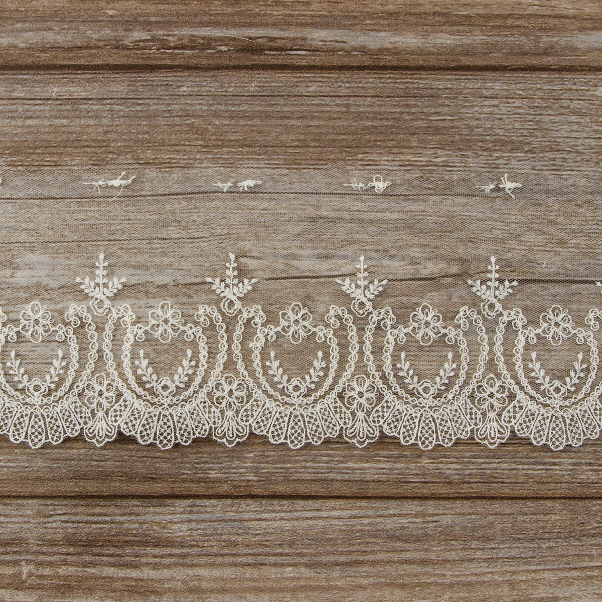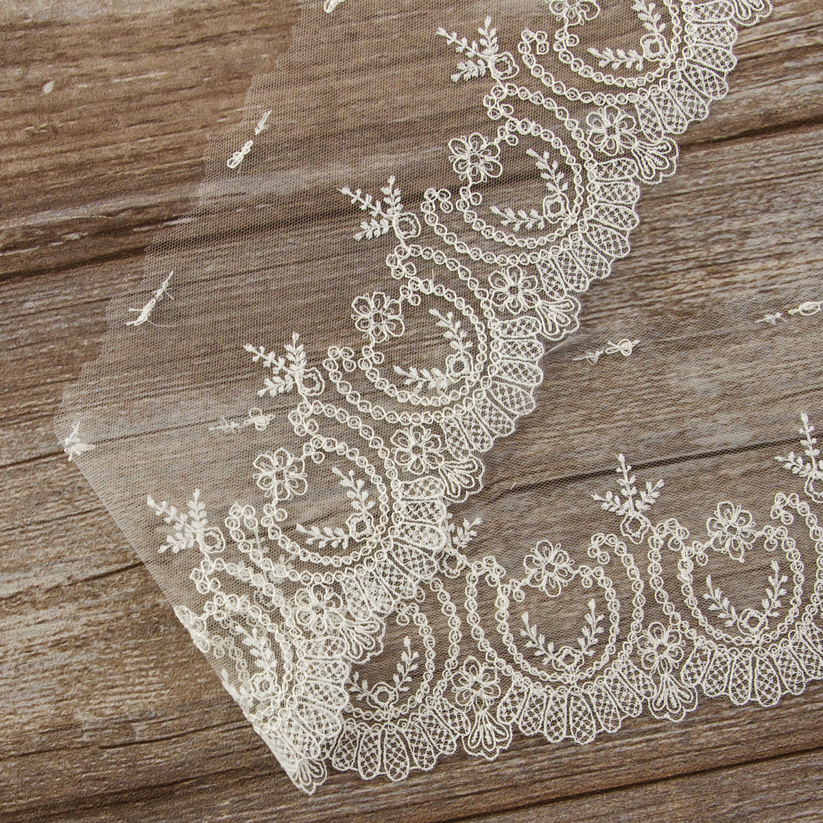 Вышивка выполнена матовыми полиэстеровыми нитями №110. Тюль-основа из 100% полиэстера белого цвета имеет запас на растяжимость, не дает стягивания швов, края не осыпаются. Применяется для отделки свадебных и нарядных женских платьев. Также применяется для отделки женских платьев, юбок и жакетов из легких и средней плотности тканей, например сукна и габардина; великолепно подходит для отделки женского белья и одежды из трикотажа; изысканно смотрится как отделка вязаных изделий. Кружево на тюле мягкое, удобно в носке и легкое в уходе, не мнется. Стирать в режиме деликатной стирки, сушить в расправленном виде, гладить с изнаночной стороны в 1 или 2 температурном режиме.