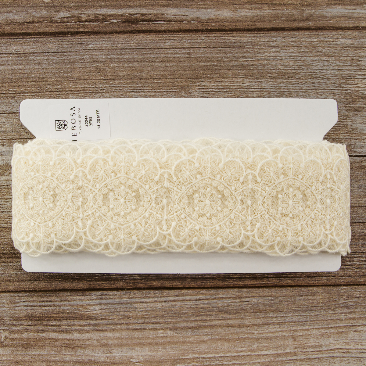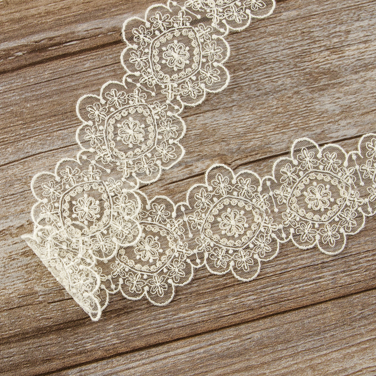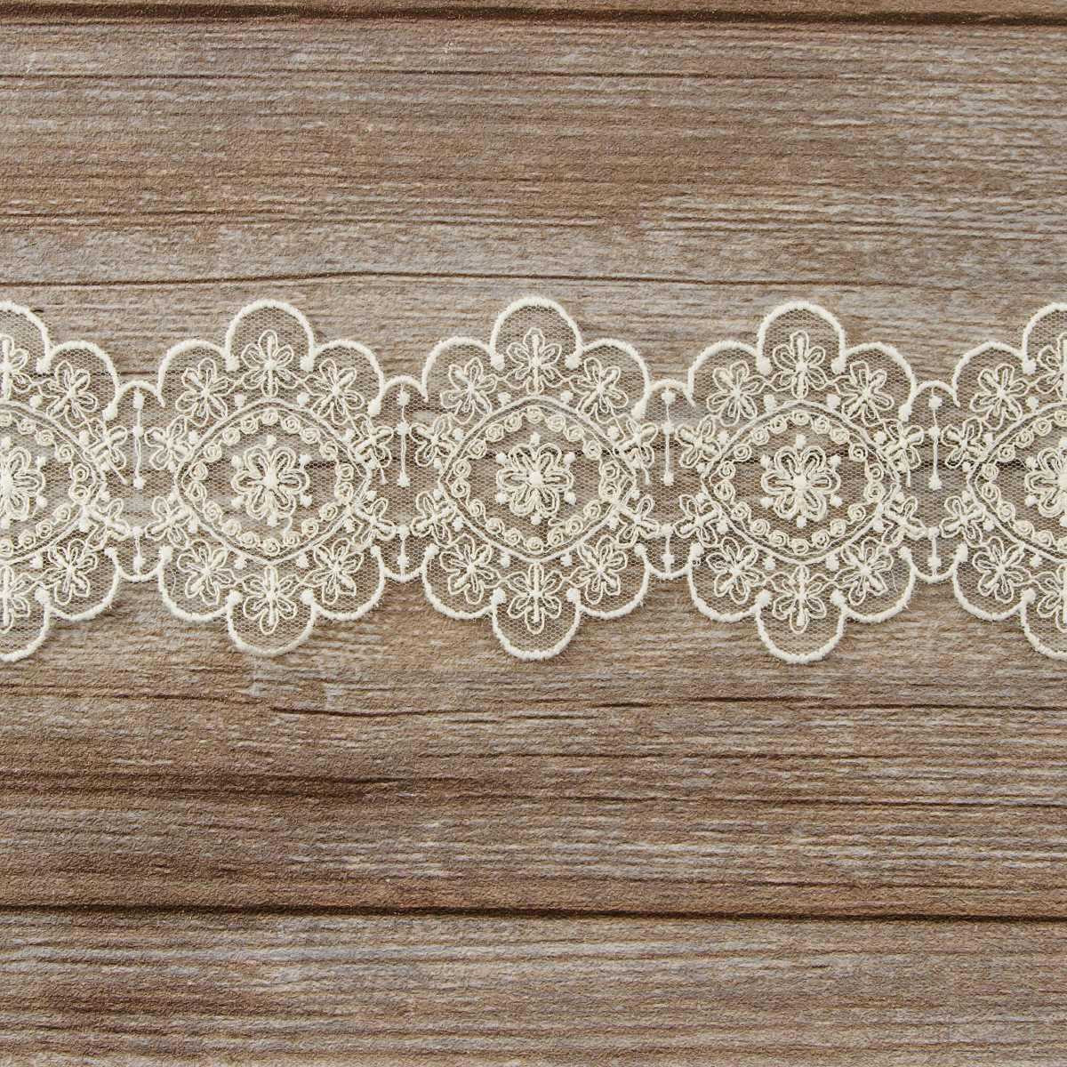 Вышивка выполнена матовыми полиэстеровыми нитями №110. Тюль-основа из 100% полиэстера белого цвета имеет запас на растяжимость, не дает стягивания швов, края не осыпаются. Применяется для отделки свадебных и нарядных женских платьев. Также применяется для отделки женских платьев, юбок и жакетов из легких и средней плотности тканей, например сукна и габардина; великолепно подходит для отделки женского белья и одежды из трикотажа; изысканно смотрится как отделка вязаных изделий. Кружево на тюле мягкое, удобно в носке и легкое в уходе, не мнется. Стирать в режиме деликатной стирки, сушить в расправленном виде, гладить с изнаночной стороны в 1 или 2 температурном режиме.