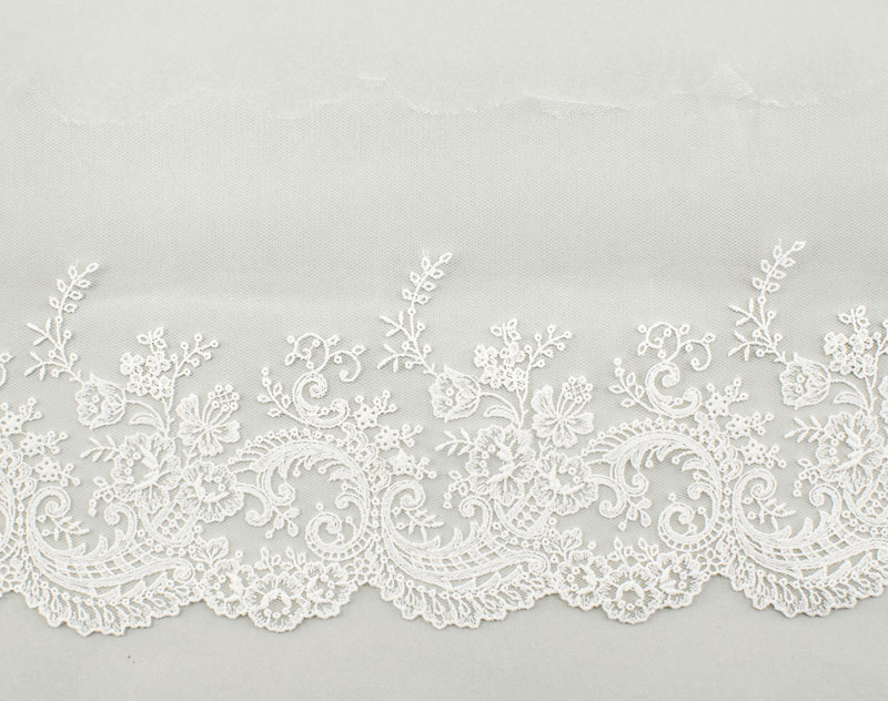 Вышивка выполнена матовыми полиэстеровыми нитями №110. Тюль-основа из 100% полиэстера имеет запас на растяжимость, не дает стягивания швов, края не осыпаются. Применяется для отделки свадебных и нарядных женских платьев. Также применяется для отделки женских платьев, юбок и жакетов из легких и средней плотности тканей, например сукна и габардина; великолепно подходит для отделки женского белья и одежды из трикотажа; изысканно смотрится как отделка вязаных изделий. Кружево на тюле мягкое, удобно в носке и легкое в уходе, не мнется. Стирать в режиме деликатной стирки, сушить в расправленном виде, гладить с изнаночной стороны в 1 или 2 температурном режиме.