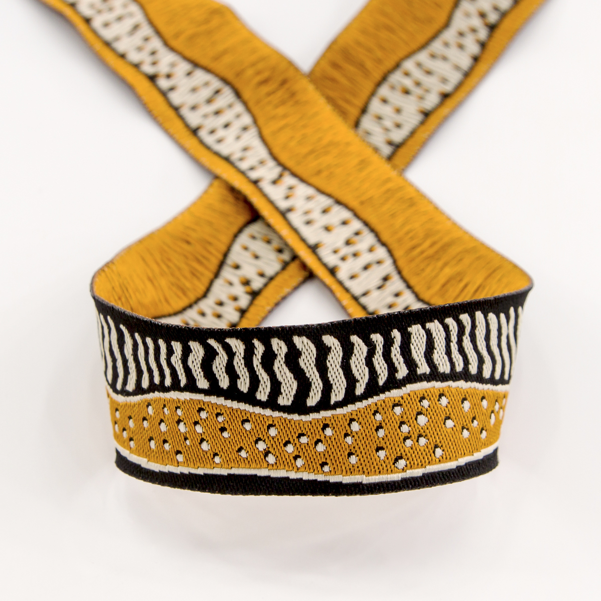 Лента жаккард прочна и долговечна, слабо растягивается, устойчива к истиранию, не линяет. Своеобразный рельефный рисунок сложного переплетения на плотной ткани напоминает гобелен. Стирка желательна при невысоких температурах (+30 °С). Крайне нежелательно отбеливать и отжимать, а также сушить под прямыми солнечными лучами. Гладить лучше с изнаночной стороны. Жаккардовые ленты широко используется для отделки штор, одежды, подушек и других творческих проектов