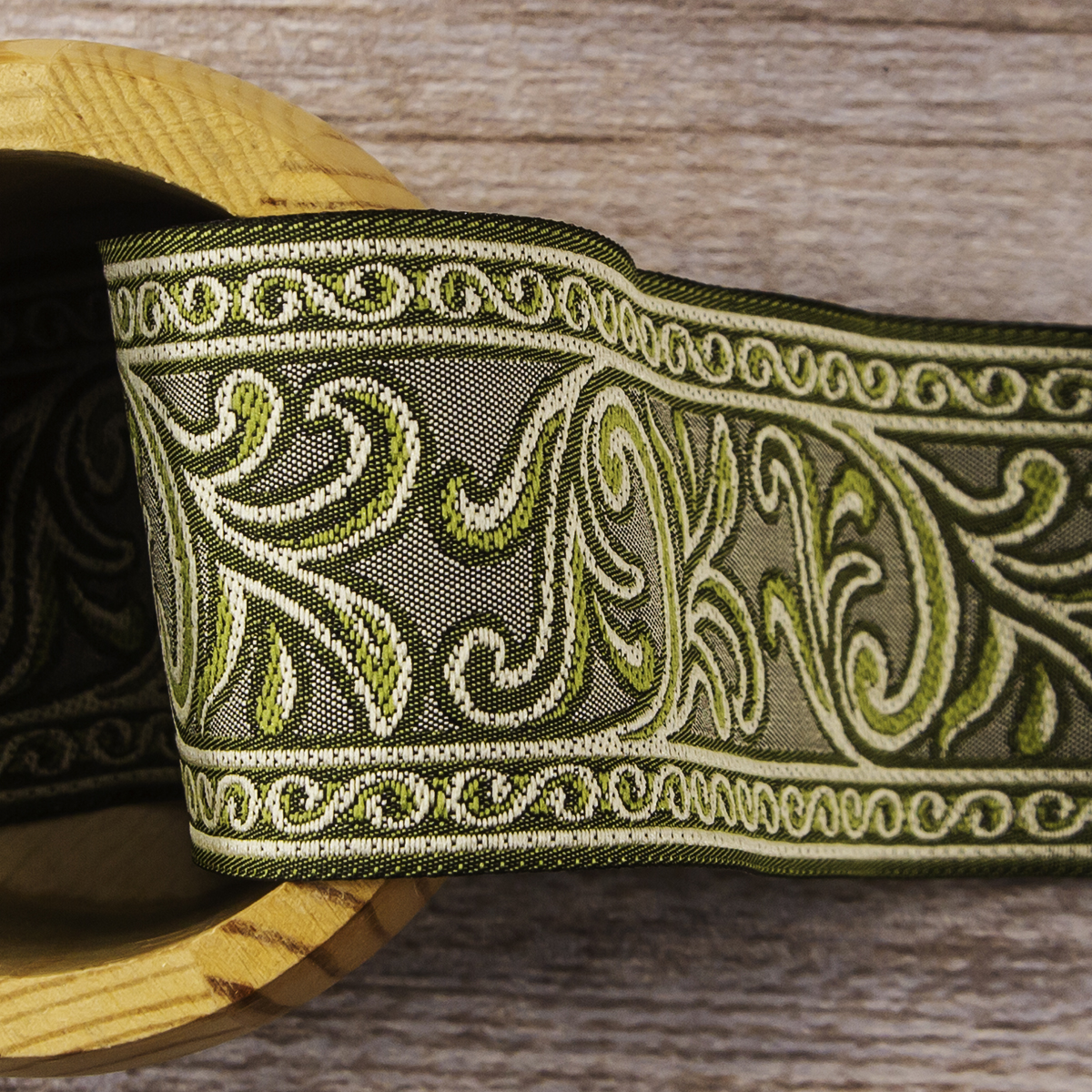 Лента жаккард прочна и долговечна, слабо растягивается, устойчива к истиранию, не линяет. Своеобразный рельефный рисунок сложного переплетения на плотной ткани напоминает гобелен. Стирка желательна при невысоких температурах (+30 °С). Крайне нежелательно отбеливать и отжимать, а также сушить под прямыми солнечными лучами. Гладить лучше с изнаночной стороны. Жаккардовые ленты широко используется для отделки штор, одежды, подушек и других творческих проектов