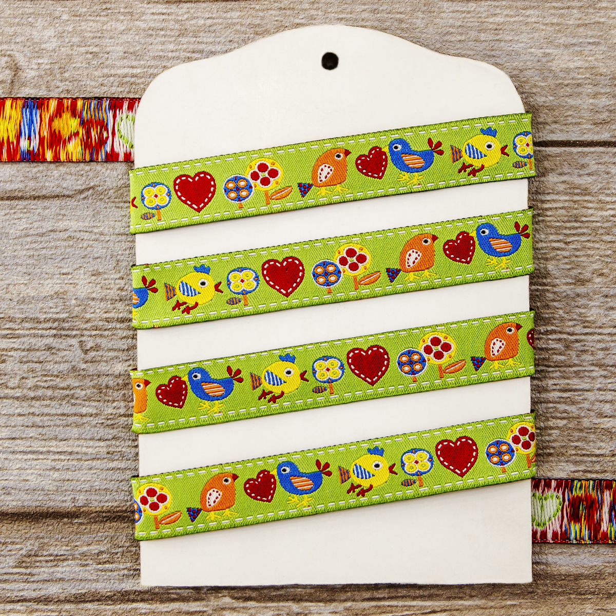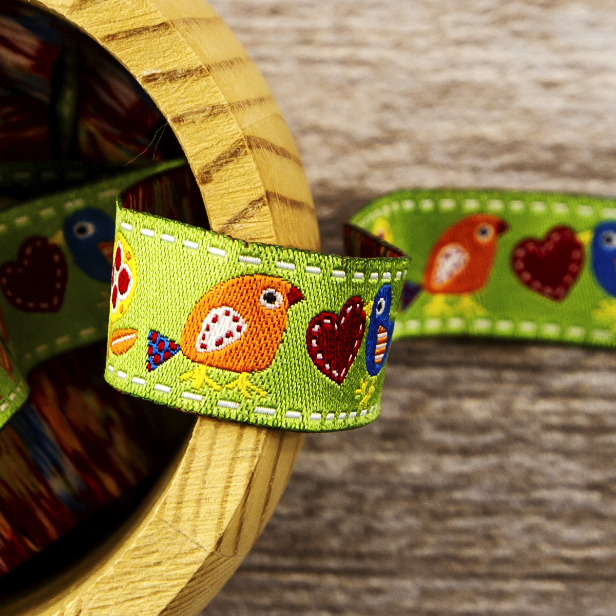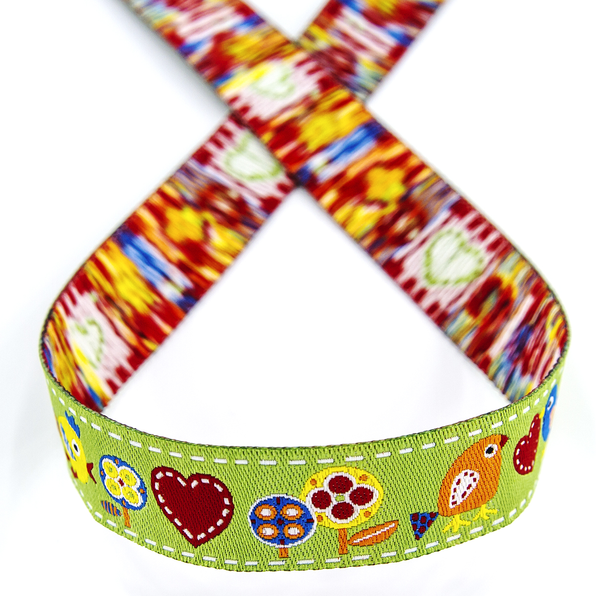 Лента жаккард прочна и долговечна, слабо растягивается, устойчива к истиранию, не линяет. Своеобразный рельефный рисунок сложного переплетения на плотной ткани напоминает гобелен. Стирка желательна при невысоких температурах (+30 °С). Крайне нежелательно отбеливать и отжимать, а также сушить под прямыми солнечными лучами. Гладить лучше с изнаночной стороны. Жаккардовые ленты широко используется для отделки штор, одежды, подушек и других творческих проектов