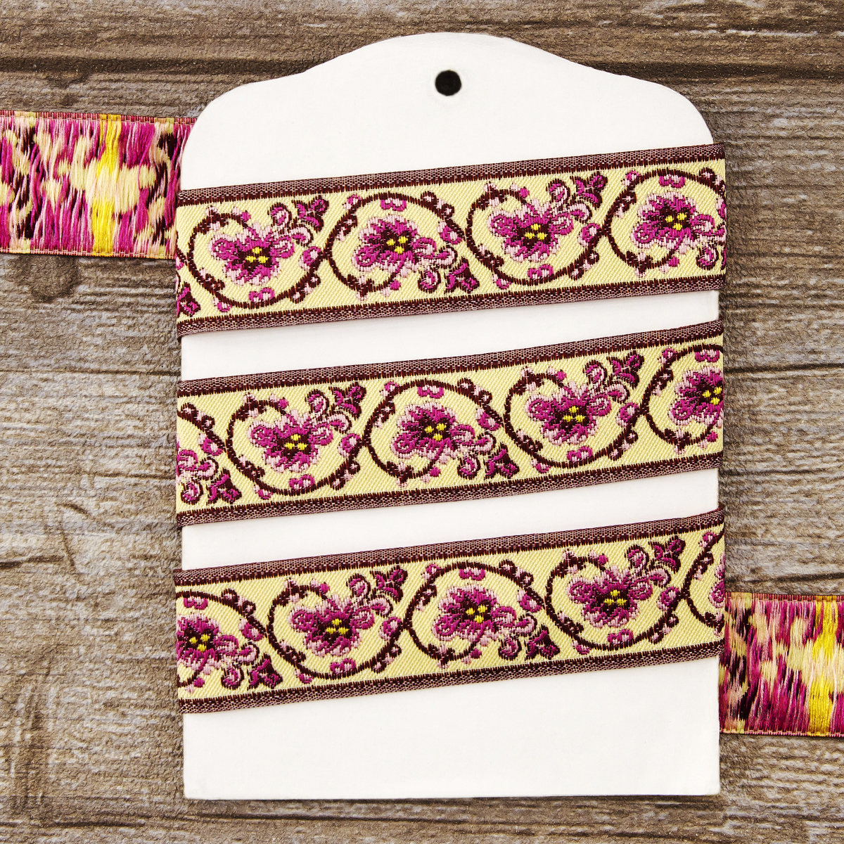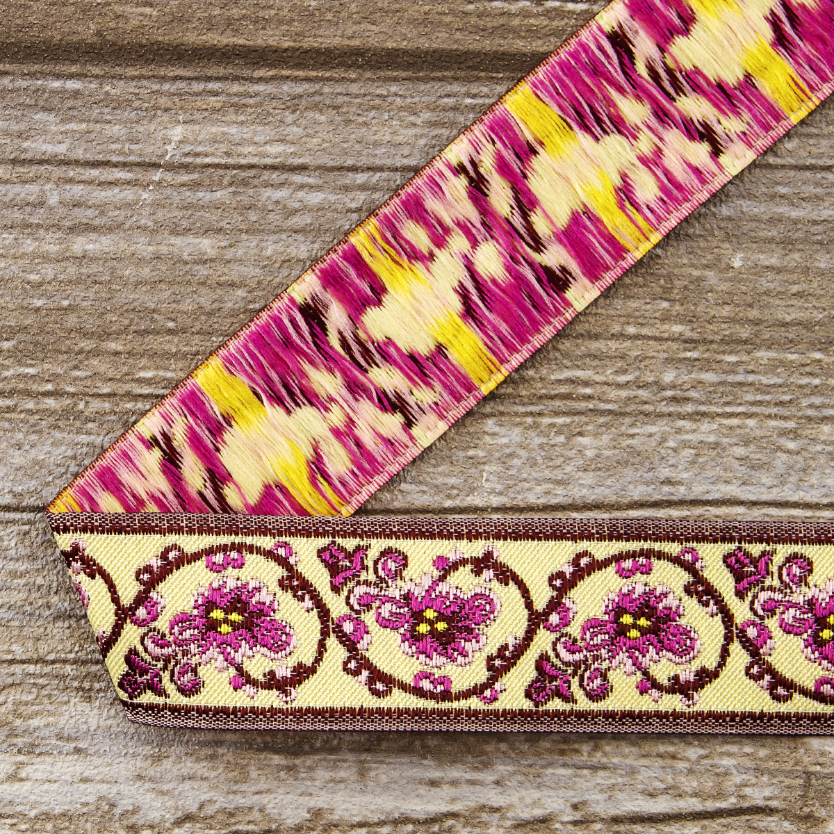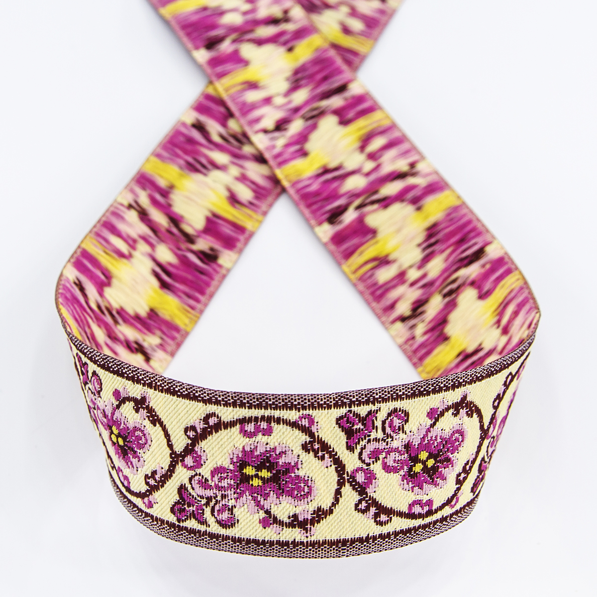 Лента жаккард прочна и долговечна, слабо растягивается, устойчива к истиранию, не линяет. Своеобразный рельефный рисунок сложного переплетения на плотной ткани напоминает гобелен. Стирка желательна при невысоких температурах (+30 °С). Крайне нежелательно отбеливать и отжимать, а также сушить под прямыми солнечными лучами. Гладить лучше с изнаночной стороны. Жаккардовые ленты широко используется для отделки штор, одежды, подушек и других творческих проектов