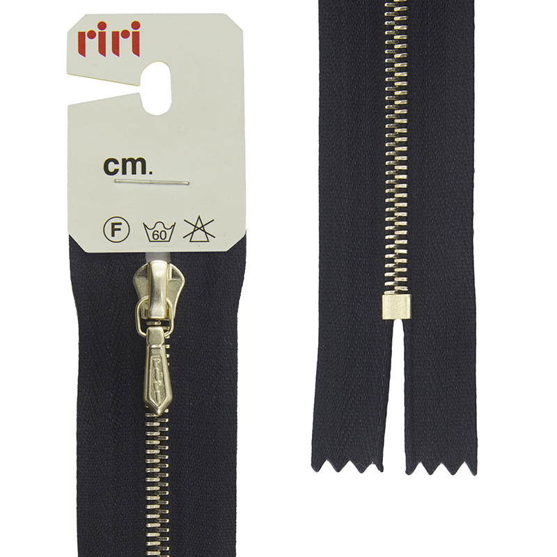 Функция верхнего слайдера - автофиксация. Отделка верхнего слайдера - тип Tropf, на обратной стороне выбит фирменный логотип "riri". Звено и бегунки имеют цвет золотистого покрытия, нанесённое гальваническим способом. Бегунок riri представляет собой монотело, сопротивление разрыву замка и подвески на замке в 2 раза больше, чем на аналогичных изделиях других производителей! Процесс обработки зубцов для металлических "молний" riri гальванопокрытием предотвращают окисление зубцов.