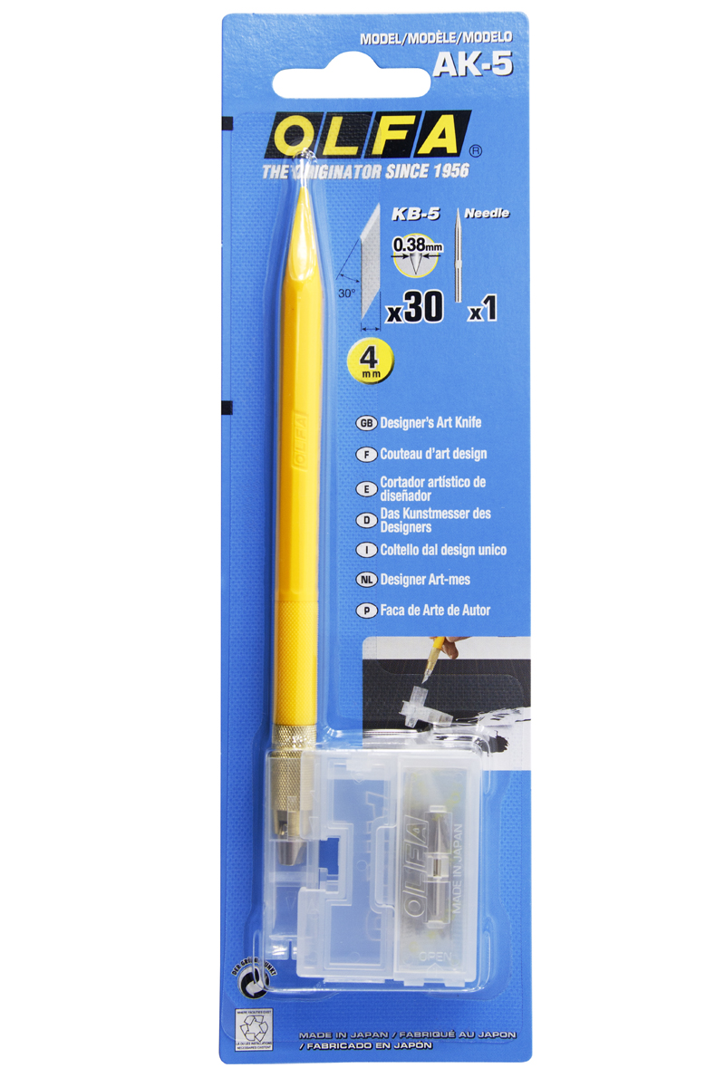 В комплекте поставляется 5 лезвий KB-5 шириной 4 мм, и игла для разметки различных материалов длиной 20 мм и диаметром 1,6 мм. Зажим лезвий осуществляется с помощью проверенной цанги из бронзового сплава (аналогично AK-3), которая обеспечивает быструю и надежную фиксацию лезвия. Ребристая форма рукоятки ножа Olfa, препятствует его скатыванию со стола. Специальный контейнер для хранения лезвий включает в себя механизм трансформации, который позволяет его использовать в качестве настольной подставки для ножа. Рукоятка на конце в форме шпателя используется для разглаживания клейких материалов и формовки различных пластичных материалов (например из глины).