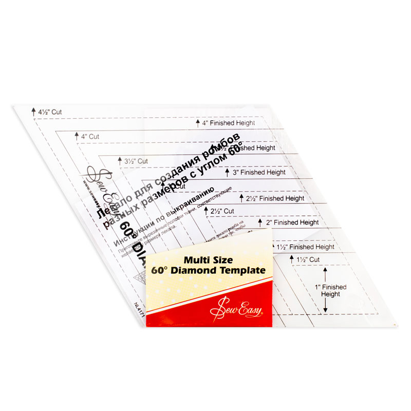 Шаблон предназначен для кроя ромбов и треугольников с углом 60* и изготовления шаблонов для кроя ромбов (или треугольников) меньшего размера. Шаг 1 дюйм. На шаблоне размечены припуски 1/4 дюйма. Цвет разметки чёрный. Инструкция по использованию на русском языке внутри упаковки.