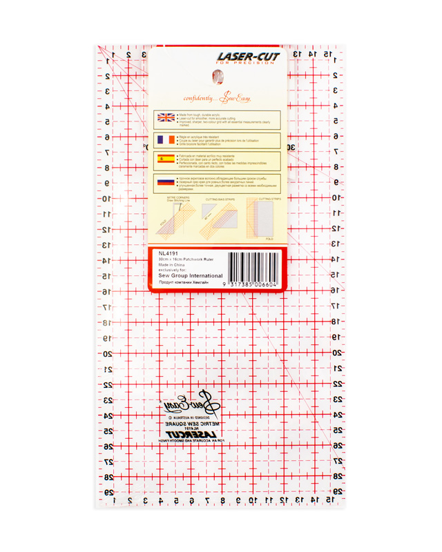 Линейка выполняет функцию основной линейки для кроя большинства деталей. Градация в сантиметрах, шаг 0,5 см. Расчерчены углы 45*, 60 *, 30*