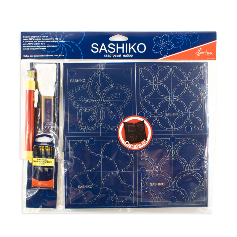 В состав набора входят: лоскут ткани темно-синего цвета натуральный хлопок 50 х 142 см; 4 шаблона с классическими дизайнами стежки размером 4" х 4" каждый; нить для вышивки белого цвета толщиной 20/4 в мотке 40 м; карандаш для ткани арт ER292 с шестью выдвижными меловыми грифелями разных цветов (для сашико по синей ткани рекомендуем делать белую или желтую разметку) и набор вышивальных игл №3-9 в пластиковом футляре. Инструкция на русском языке на упаковке.