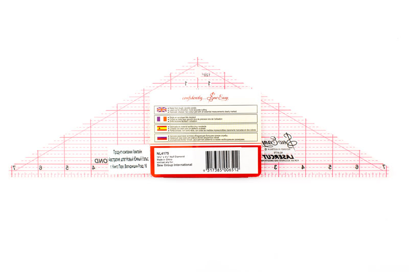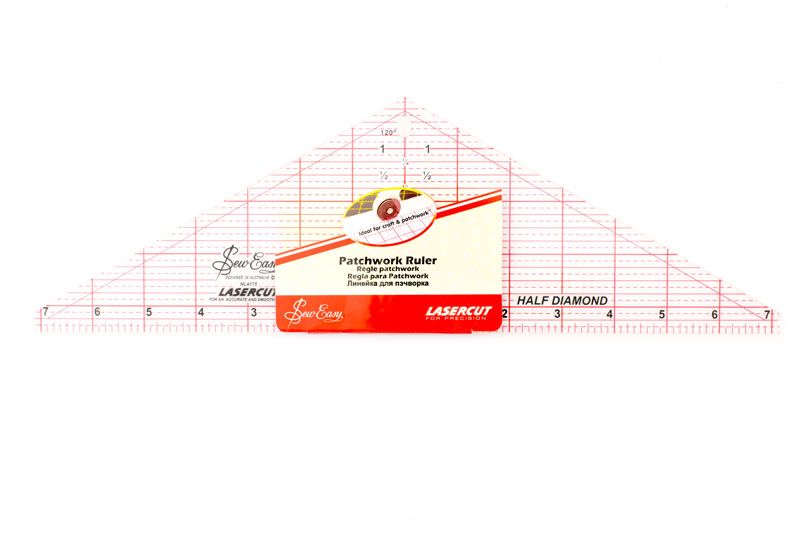 Линейка для раскроя ромбов и полуромбов. Острые углы скошены для точности и экономии ткани при раскрое. Разметка 1/2", 1/4", 1/8"б размечен припуск по кроям на 1/4''.