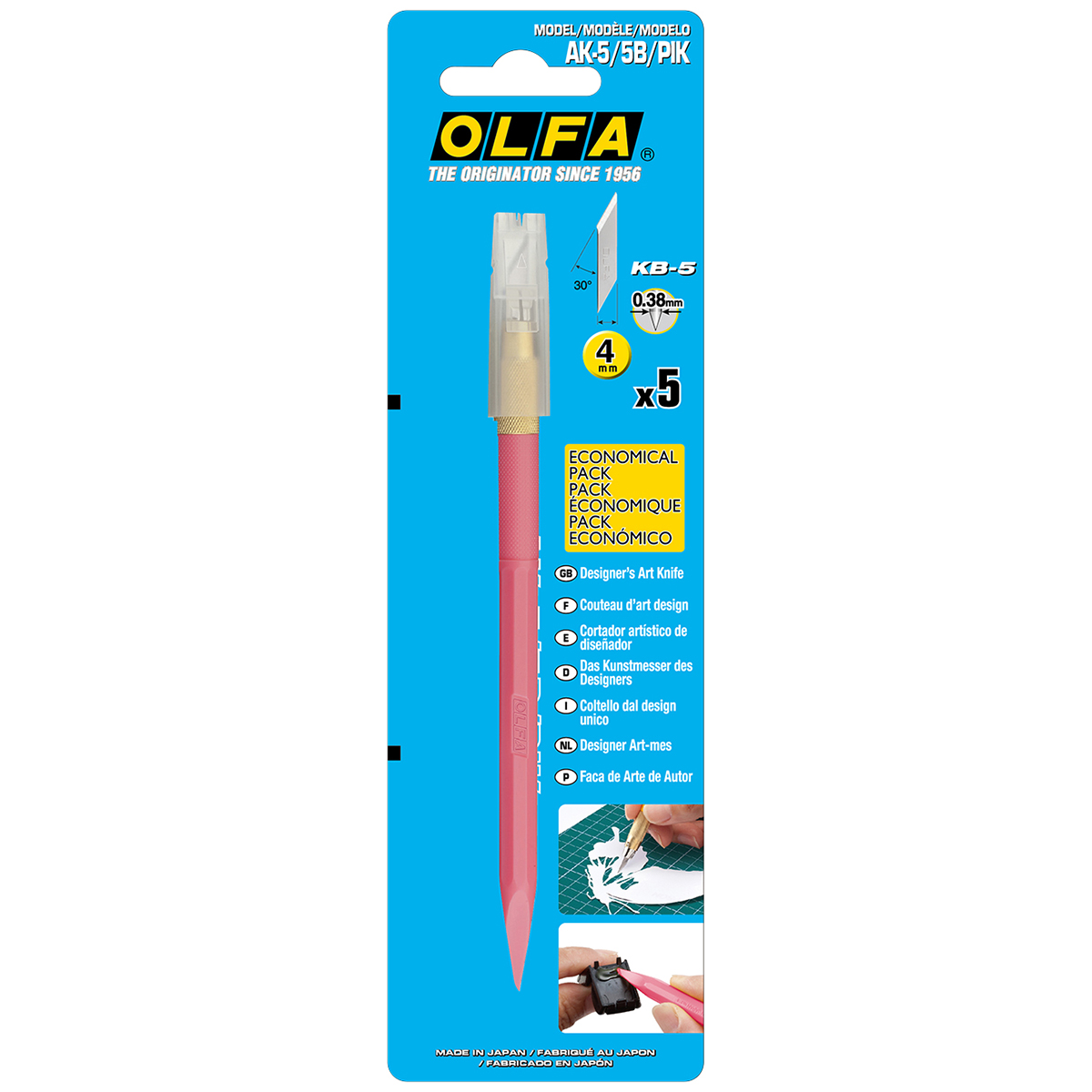 В комплекте поставляется 5 лезвий KB-5 шириной 4 мм, и игла для разметки различных материалов длиной 20 мм и диаметром 1,6 мм. Зажим лезвий осуществляется с помощью проверенной цанги из бронзового сплава (аналогично AK-3), которая обеспечивает быструю и надежную фиксацию лезвия. Ребристая форма рукоятки ножа Olfa, препятствует его скатыванию со стола. Специальный контейнер для хранения лезвий включает в себя механизм трансформации, который позволяет его использовать в качестве настольной подставки для ножа. Рукоятка на конце в форме шпателя используется для разглаживания клейких материалов и формовки различных пластичных материалов (например из глины).