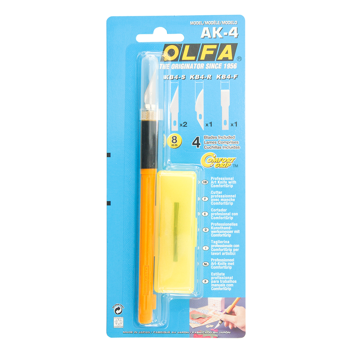 Нож для особо точного вырезания деталей и аппликаций; в комплекте 3 вида лезвий КВ4 - S, KB4 - F , KB4 - R (по 1 штуке) формы: прямое, скос, дуга; применяется для кожи, меха, войлока, фетра, ткани, бумаги, картона, ламинированных бумаг, вспененного пластика и других материалов