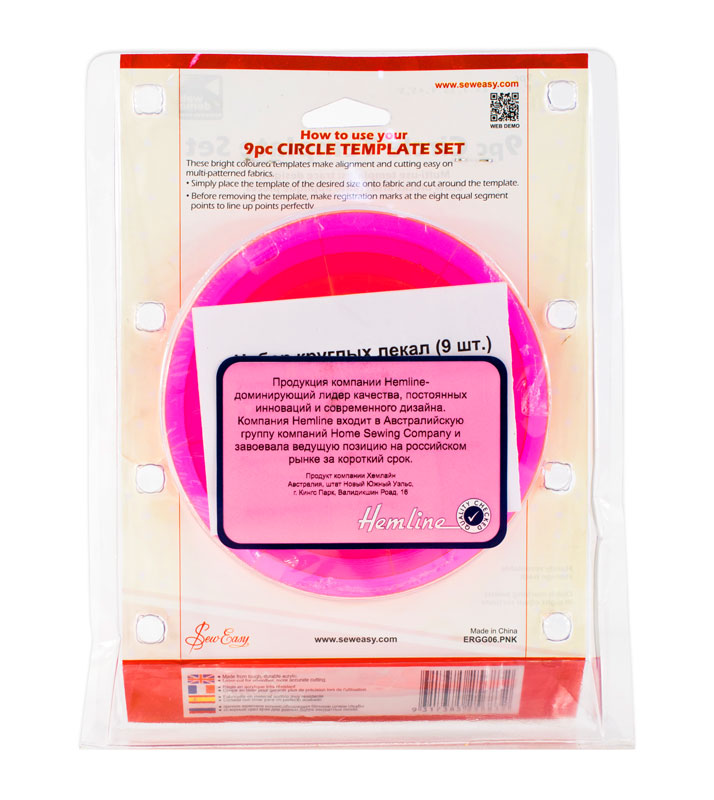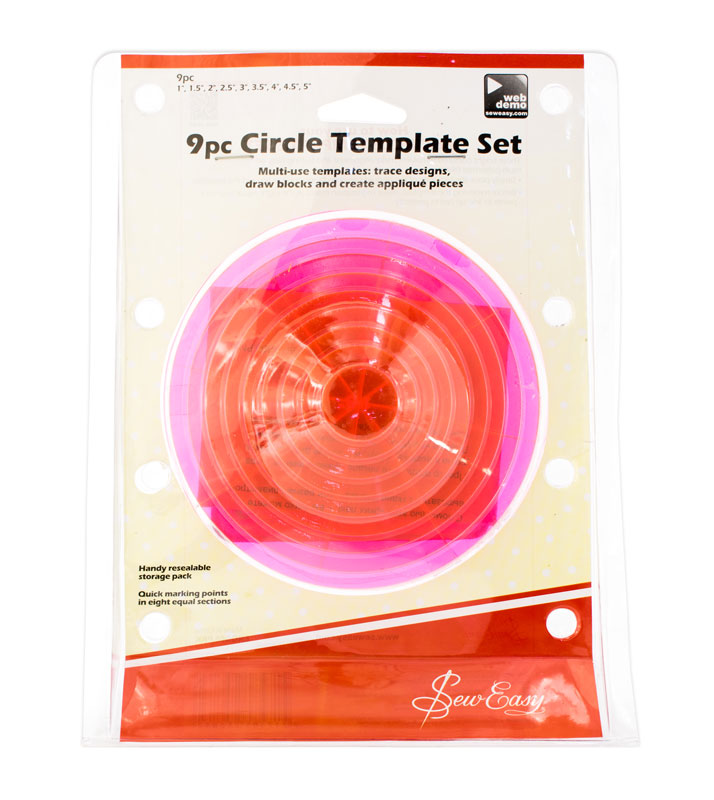 С помощью этих ярких лекал вы можете вырезать из ткани ровные круги 9-ти разных диаметров. Размеры в дюймах. На лекале нанесена разметка сегментов 1/8 круга.