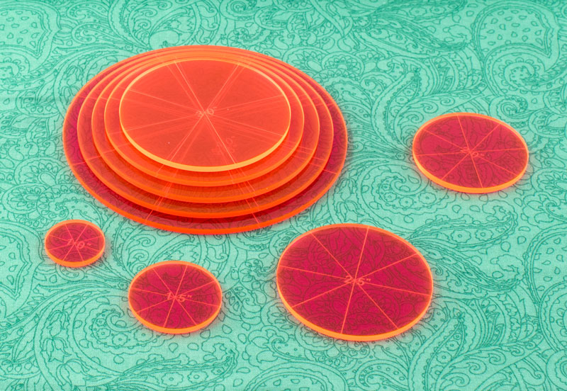 С помощью этих ярких лекал вы можете вырезать из ткани ровные круги 9-ти разных диаметров. Размеры в дюймах. На лекале нанесена разметка сегментов 1/8 круга.
