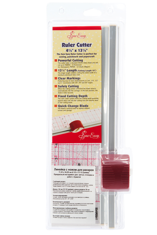 Линейка с ножом для раскроя. Сфера применения - пэчворк. Безопасный раскрой обеспечивает лезвие в пластиковом корпусе. Лезвие легко заменяется. Глубина разреза регулируется нажатием на корпус с лезвием. Удобная ручка для открытия и закрытия ножа.