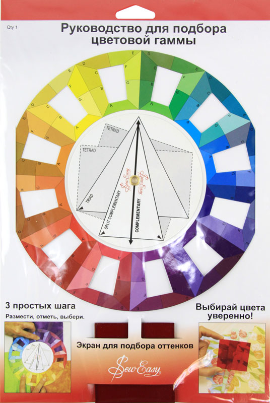 В комплект входит пластина красного цвета, так называемый "экран", он служит для подбора сочетания общего тона и выбранных цветов. Смотрим через экран, видим, что оттенок ткани поменялся и общий тон стал средним или темным. Особенно рекомендуем применять экран в лоскутном шитье.