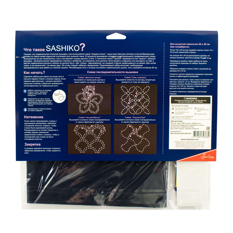 В состав набора входят: лоскут ткани темно-синего цвета натуральный хлопок 50 х 142 см; 4 шаблона с классическими дизайнами стежки размером 4" х 4" каждый; нить для вышивки белого цвета толщиной 20/4 в мотке 40 м; карандаш для ткани арт ER292 с шестью выдвижными меловыми грифелями разных цветов (для сашико по синей ткани рекомендуем делать белую или желтую разметку) и набор вышивальных игл №3-9 в пластиковом футляре. Инструкция на русском языке на упаковке.