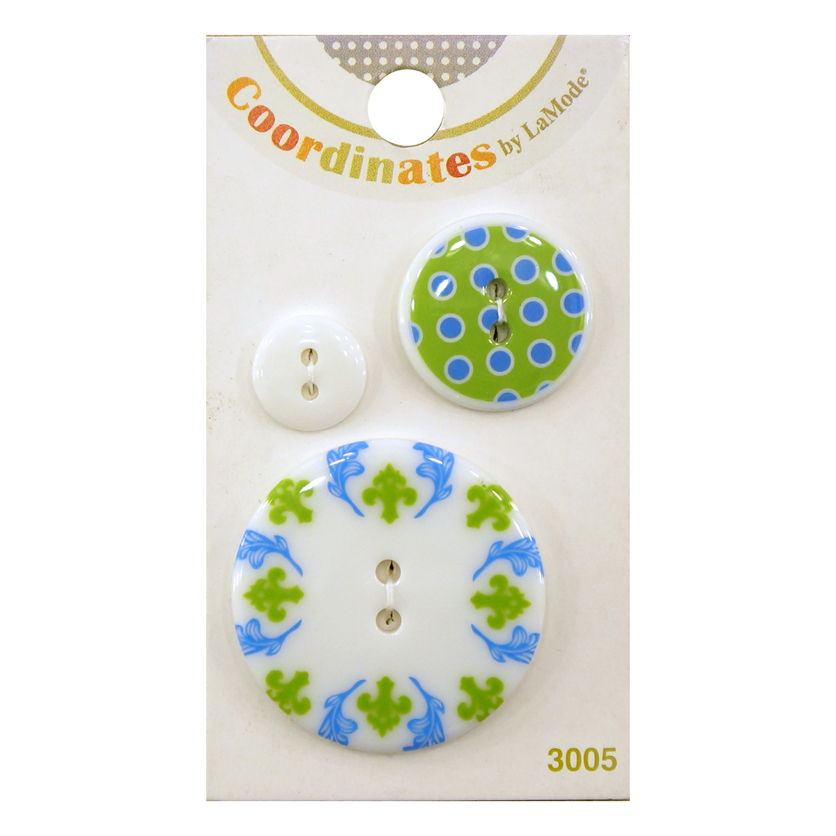 Набор из трех пластиковых пуговиц разного размера и формы из коллекции “Coordinates II” прекрасно подойдет для декора различных изделий и практичны в использовании.