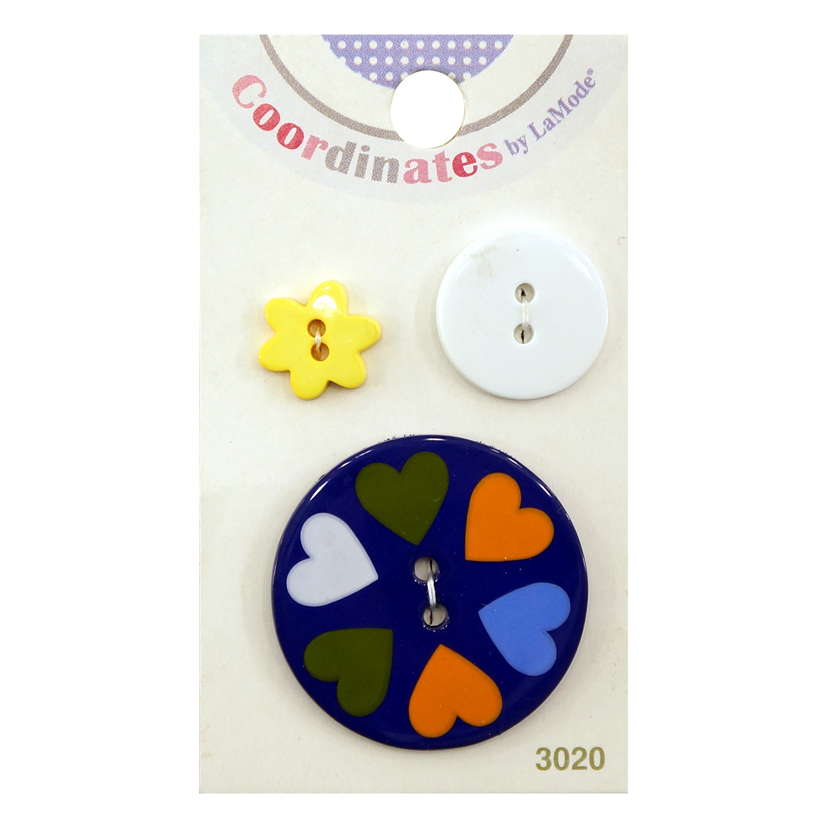 Набор из трех пластиковых пуговиц разного размера и формы из коллекции “Coordinates II” прекрасно подойдет для декора различных изделий и практичны в использовании.