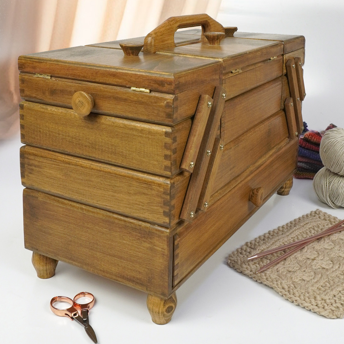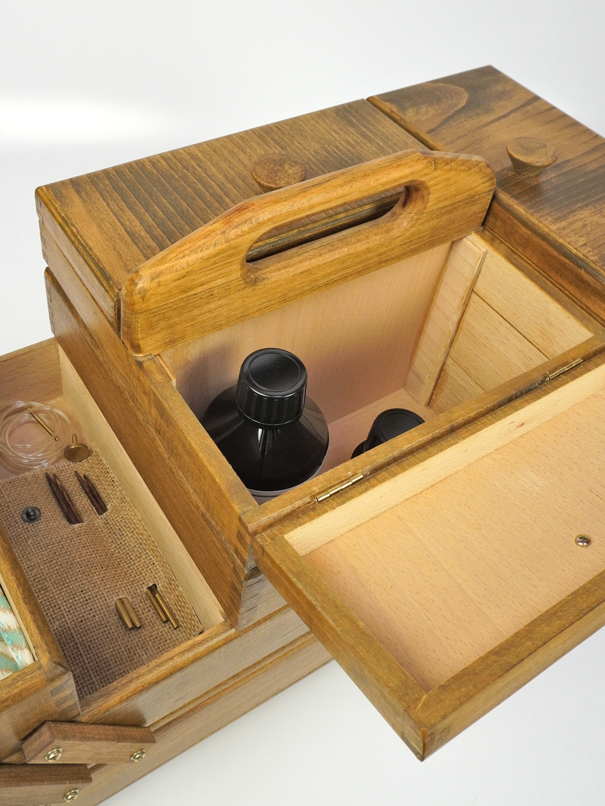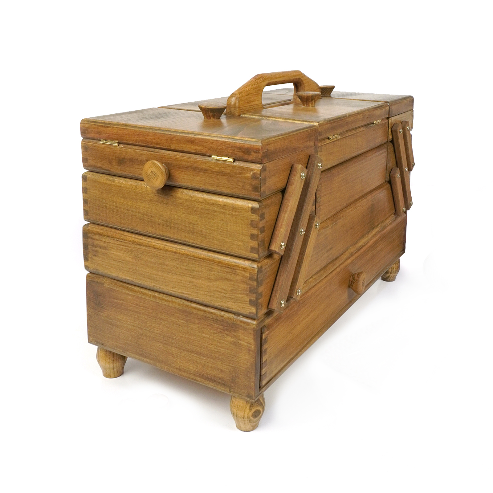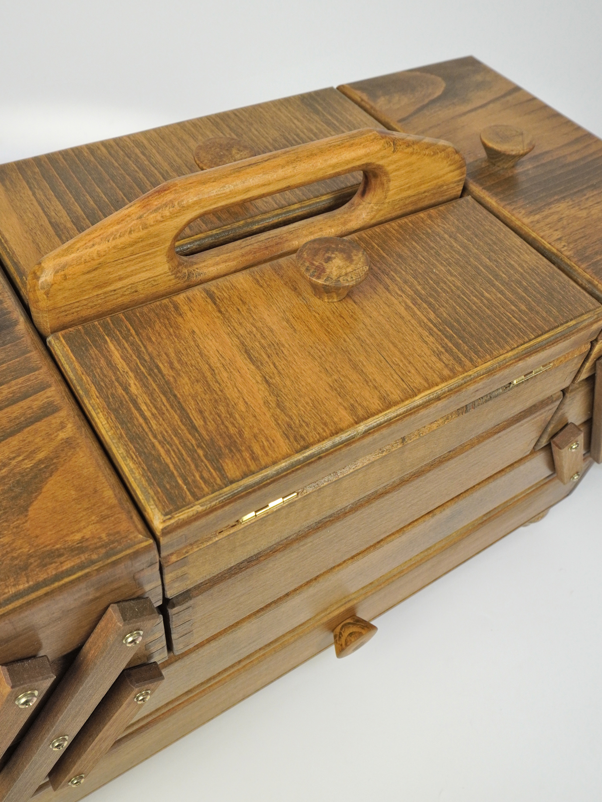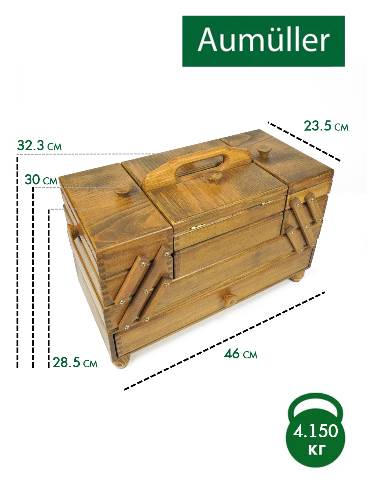 Шкатулка Aumüller предназначена для хранения фурнитуры и инструментов для шитья и рукоделия, которые всегда должны быть под рукой. Шкатулка изготовлена по немецкой технологии из прочной древесины бука, покрыта твёрдым воском с льняным тонированным маслом и акриловым лаком на водной основе. Данная модель выгодно отличается от аналогов своим более экологичным и креативным исполнением. Вместе с этим шкатулка сохранит эстетичный вид и прослужит максимально долгий срок службы. Шкатулка имеет четырехъярусную консольную систему хранения и выдвижное отделение в нижней части конструкции. Два верхних яруса могут раскладываться в ширину, открывая удобный доступ ко всем отделениям. Верхние ячейки внутри имеют разделители для более мелкой фурнитуры, такой как катушки нитей, пуговицы, булавки. Шкатулка оснащена неподвижной, несъемной ручкой для переноски. Ярусы надежно соединены прочными винтами. Все внешние поверхности шкатулки обработаны 100% натуральным карнаубским воском в сочетании с пчелиным воском и льняным маслом, а также тонированы в серый винтажный оттенок. Вощение необходимо для предотвращения растрескивания древесины и защиты от влаги. Карнаубский воск производят из листьев карнаубской пальмы — «дерева жизни», растущей в Бразилии. Воск совершенно не токсичный и применяется в пищевой и медицинской промышленности, в косметике. Таким воском покрывают музыкальные струнные инструменты (скрипки Страдивари в XVII веке также покрывались карнаубским воском). Финальное покрытие шкатулки производится акриловым лаком для грязе- и водоотталкивающих свойств, а также защиты от воздействия высоких температур, ультрафиолетовых изучений, потемнения и грибковых поражений. Размеры шкатулки В34 х Ш45 х Г24 см, вес 4,5 кг. Это оптимальный размер и пространство для хранения различных инструментов, необходимых в творчестве. Расположить шкатулку можно на столе, тумбе, полке или в сочетании с мебельными элементами для частого использования мастерами. Увлекаясь рукоделием, используйте шкатулку Aumüller, чтобы держать швейные, вышивальные или вязальные принадлежности под рукой и всегда иметь опрятную рабочую поверхность. Буковое дерево и натуральная пропитка гарантирует экологичное встраивание в ваш творческий микроклимат комнаты. Бережное использование шкатулки гарантирует долгий срок службы, принося пользу и радость вам и вашим близким своим удобством и комфортом!
