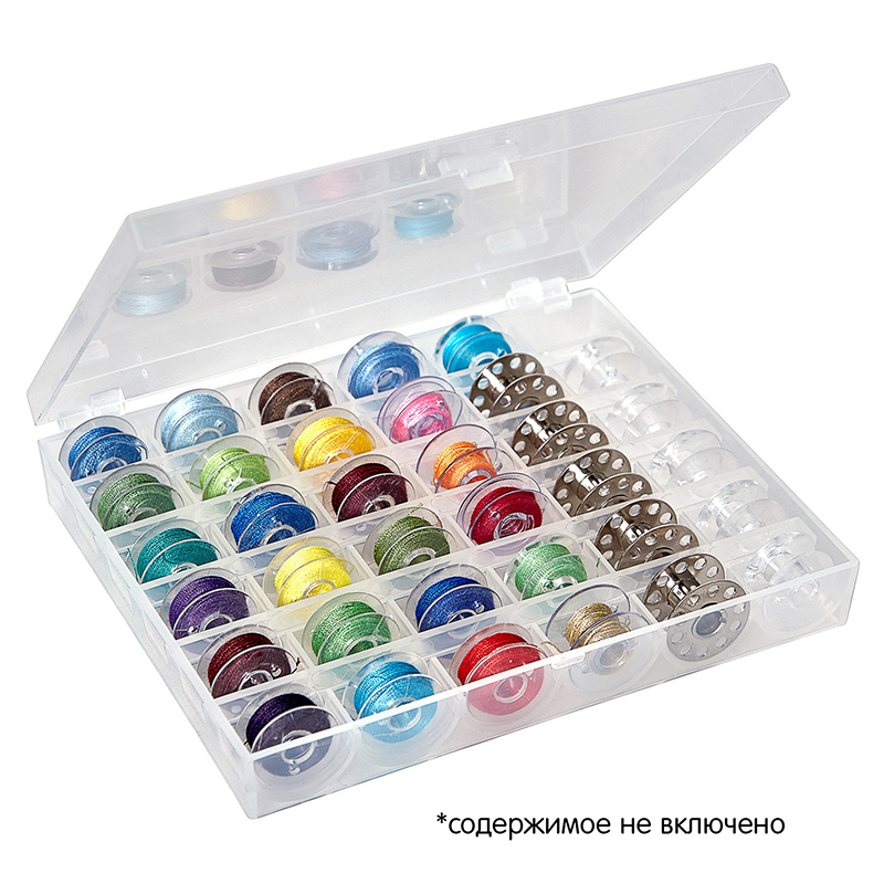 Прозрачный пластиковый органайзер для шпулек с откидной крышкой и прочными защёлками. Вмещает до 36 пластиковых или металлических шпулек. Удобно - больше никаких запутанных нитей. Изготовлен из прочного пластика. Размеры органайзера: 15 x 13 x 2.6 см. Вес брутто 95 г.