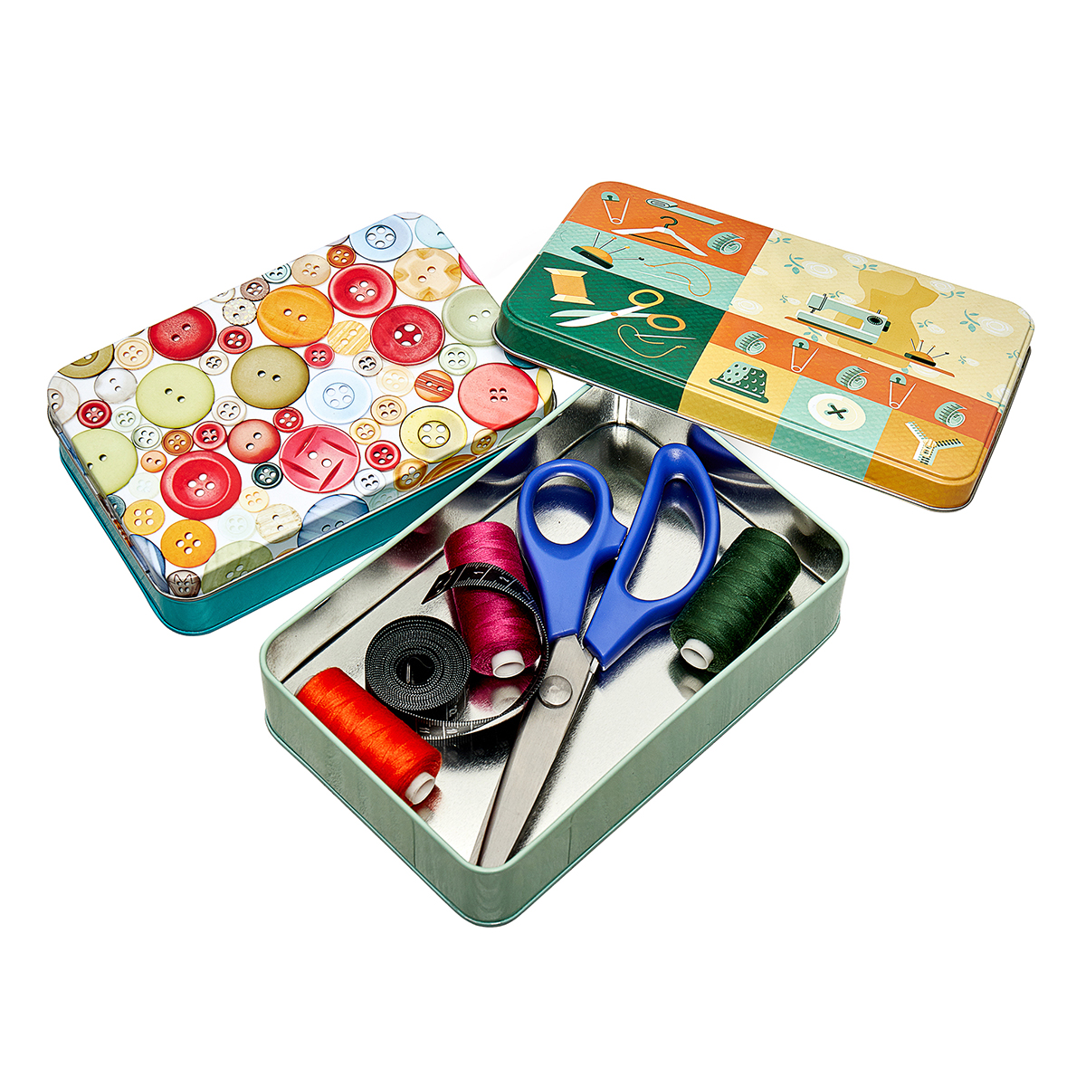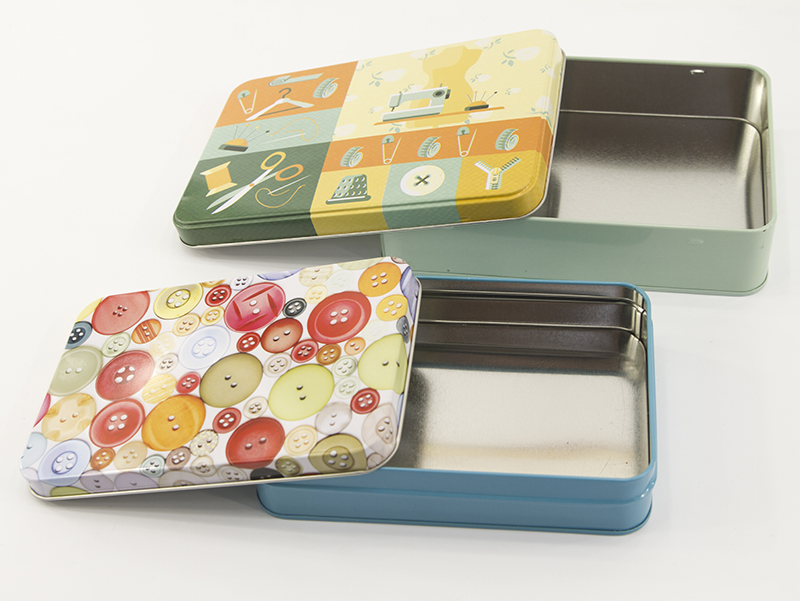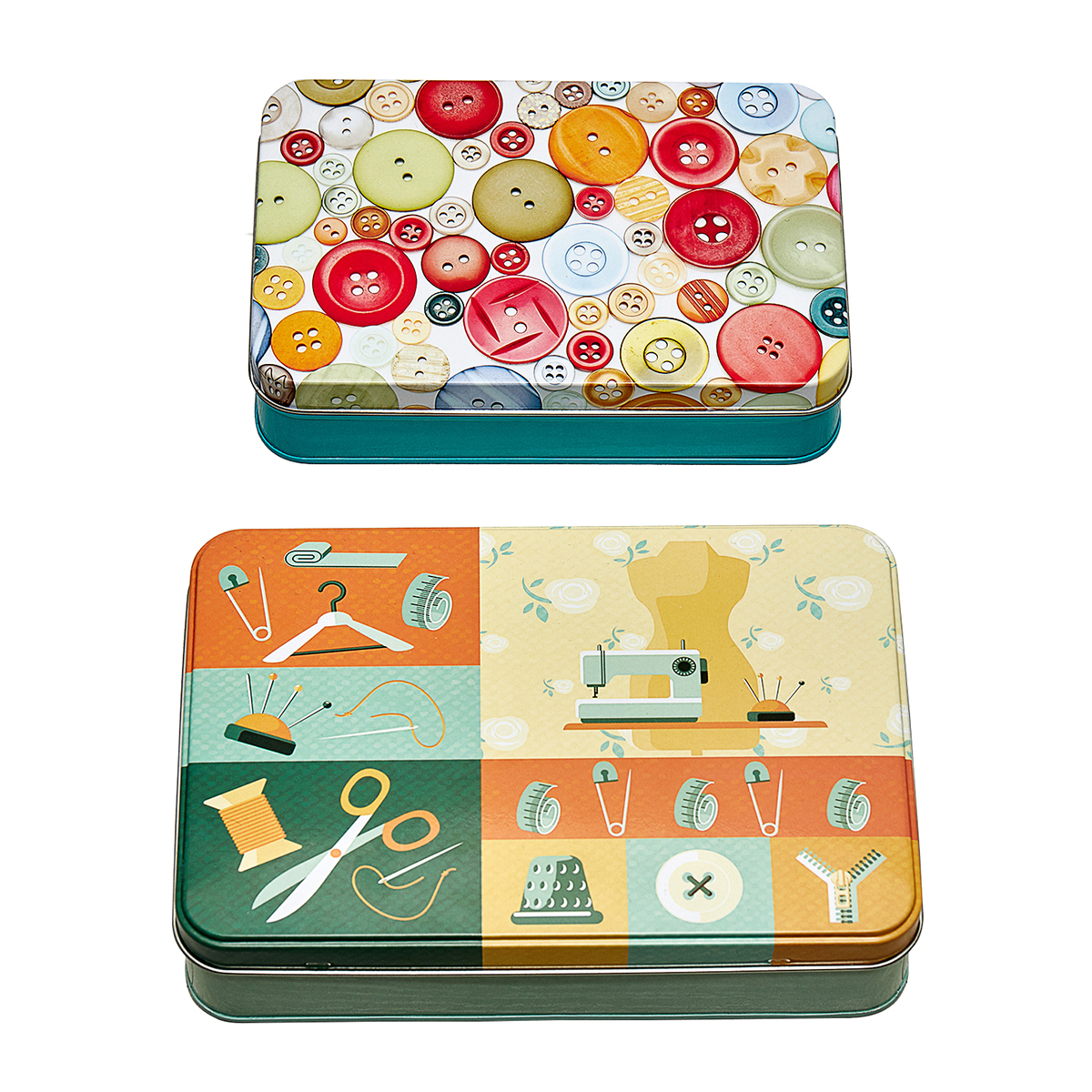 Набор металлических коробочек для мелкой фурнитуры. Красивый дизайн с швейными сюжетами. Крышки на петлях, идеально подходит для хранения всего, от ниток, рулетки до ножниц и т. д. Идеальный подарок для любителей шитья и рукоделия. Маленькая и большая баночка сочетают внутреннюю упаковку в виде набора. Размеры изделия: размер первой коробочки S:17 x 11 x 4,1 см, размер второй коробочки: L: 19 x 13 x 4,5 см. Вес брутто товара: 310 г.