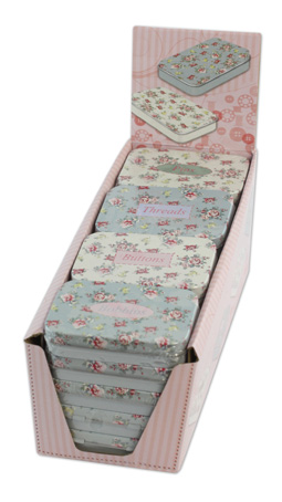 4 вида принта.Предназначены для хранения булавок, шпулек, ниток и пуговиц.Прекрасный цветочный дизайн.20 жестяных коробочек в дисплее.