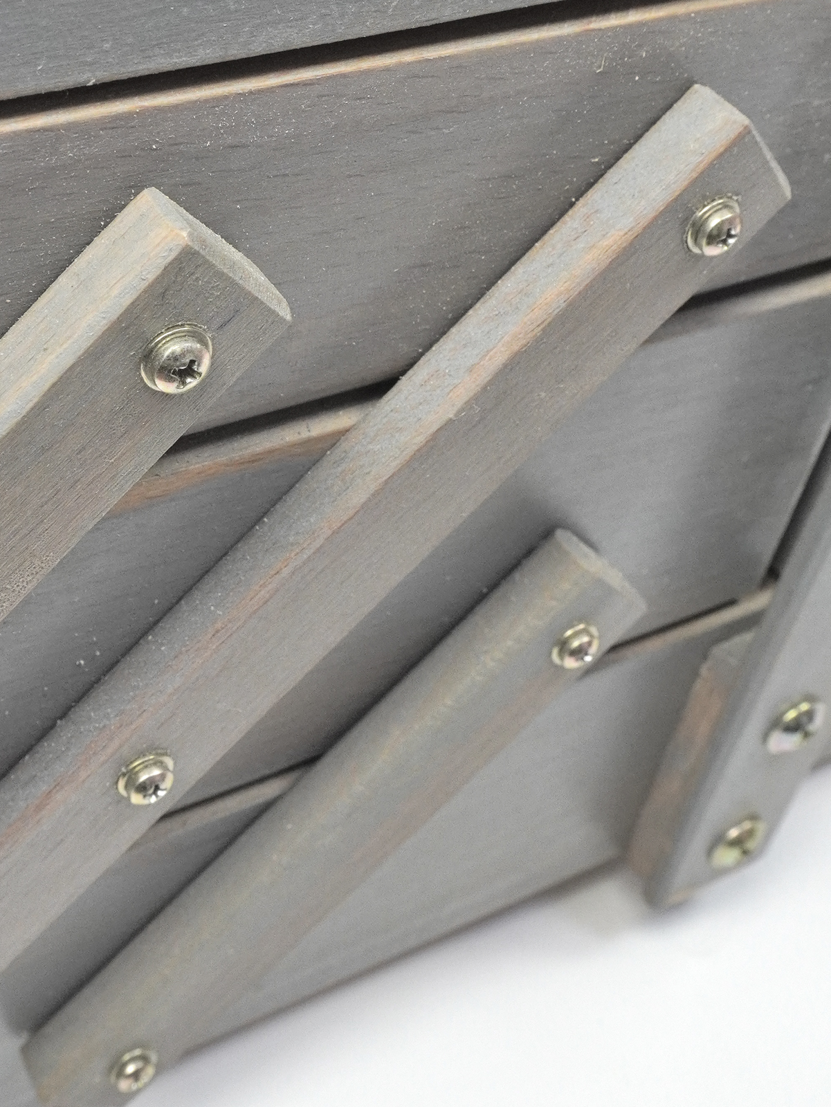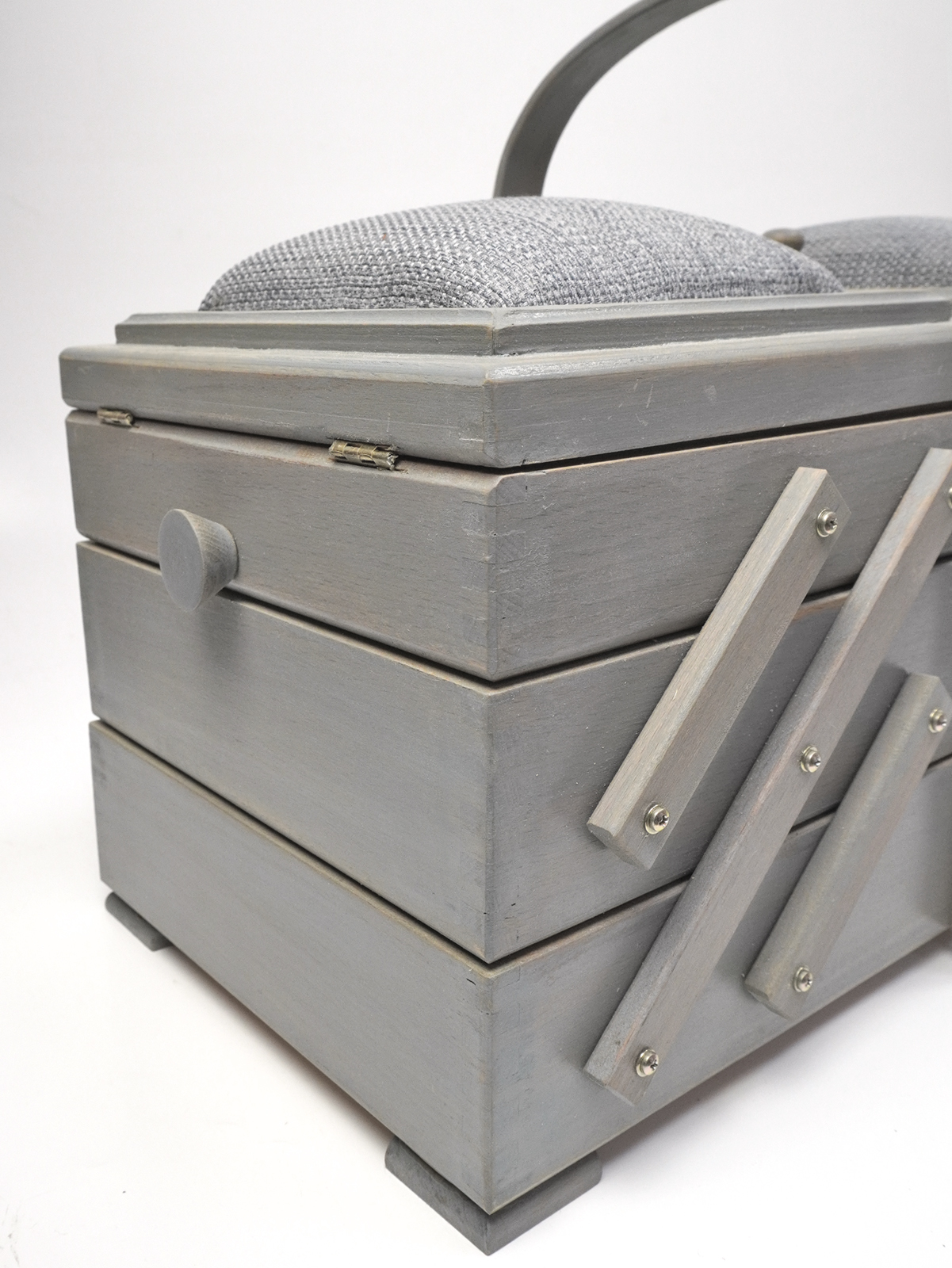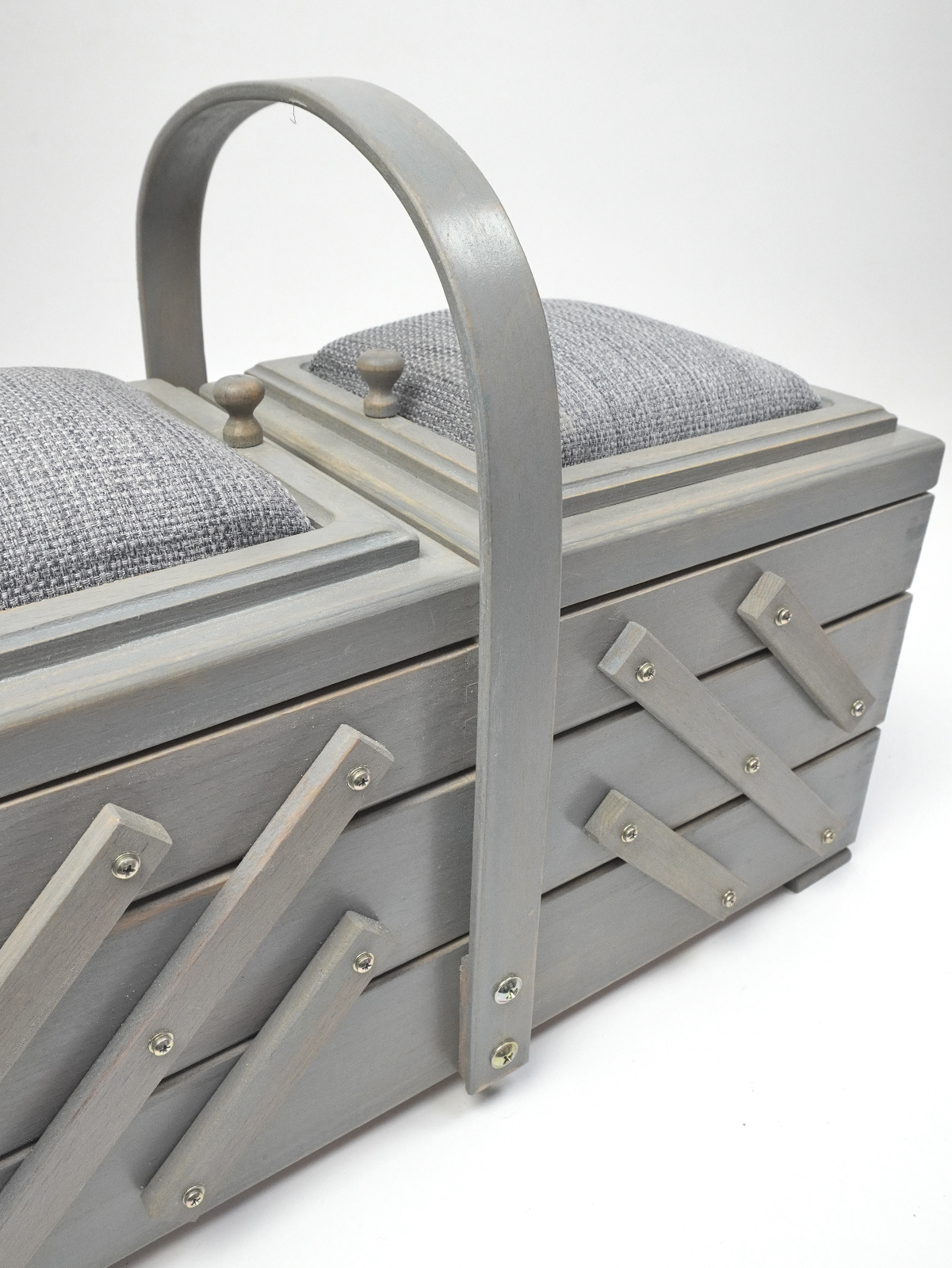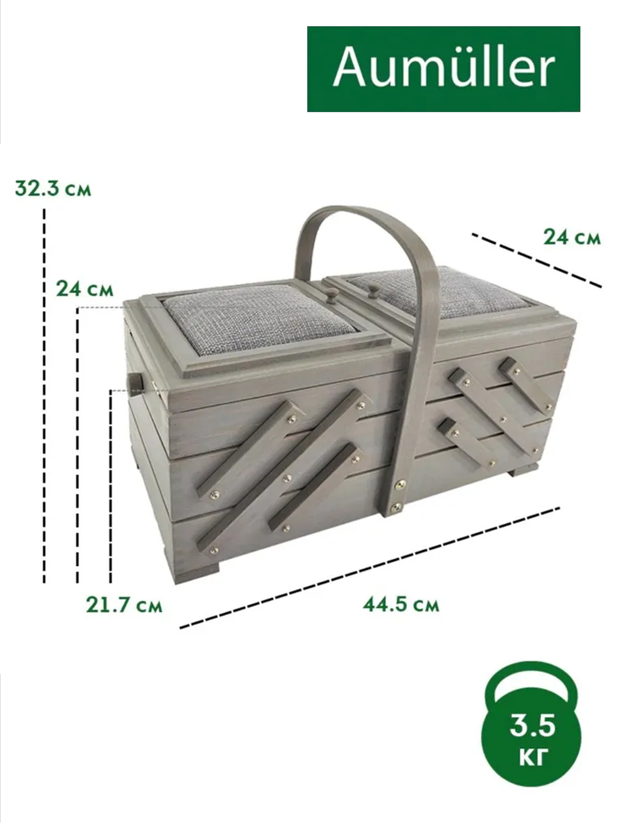 Шкатулка Aumüller предназначена для хранения фурнитуры и инструментов для шитья и рукоделия, которые всегда должны быть под рукой. Шкатулка изготовлена по немецкой технологии из прочной древесины бука, покрыта твёрдым воском с льняным тонированным маслом и акриловым лаком на водной основе. Данная модель выгодно отличается от аналогов своим более экологичным и креативным исполнением. Вместе с этим шкатулка сохранит эстетичный вид и прослужит максимально долгий срок службы. Шкатулка имеет трехъярусную консольную систему хранения. Два верхних яруса могут раскладываться в ширину, открывая удобный доступ ко всем отделениям. Верхние ячейки внутри имеют разделители для более мелкой фурнитуры, такой как катушки нитей, пуговицы, булавки. Крышки ячеек дополнены мягкими вставками, которые могут служить временными парковщиками игл и булавок. Ткань на вставках мягкая, дымчатого оттенка - под цвет шкатулки, и напоминает по виду клетчатую структуру канвы «аида». Шкатулка оснащена неподвижной, несъемной ручкой для переноски. Ярусы надежно соединены прочными винтами. Все внешние поверхности шкатулки обработаны 100% натуральным карнаубским воском в сочетании с пчелиным воском и льняным маслом, а также тонированы в серый винтажный оттенок. Вощение необходимо для предотвращения растрескивания древесины и защиты от влаги. Карнаубский воск производят из листьев карнаубской пальмы — «дерева жизни», растущей в Бразилии. Воск совершенно не токсичный и применяется в пищевой и медицинской промышленности, в косметике. Таким воском покрывают музыкальные струнные инструменты (скрипки Страдивари в XVII веке также покрывались карнаубским воском). Финальное покрытие шкатулки производится акриловым лаком для грязе- и водоотталкивающих свойств, а также защиты от воздействия высоких температур, ультрафиолетовых изучений, потемнения и грибковых поражений. Размеры шкатулки В32 х Ш44 х Г24 см, вес 3,5 кг. Это оптимальный размер и пространство для хранения различных инструментов, необходимых в творчестве. Расположить шкатулку можно на столе, тумбе, полке или в сочетании с мебельными элементами для частого использования мастерами. Увлекаясь рукоделием, используйте шкатулку Aumüller, чтобы держать швейные, вышивальные или вязальные принадлежности под рукой и всегда иметь опрятную рабочую поверхность. Буковое дерево и натуральная пропитка гарантирует экологичное встраивание в ваш творческий микроклимат комнаты. Бережное использование шкатулки гарантирует долгий срок службы, принося пользу и радость вам и вашим близким своим удобством и комфортом!