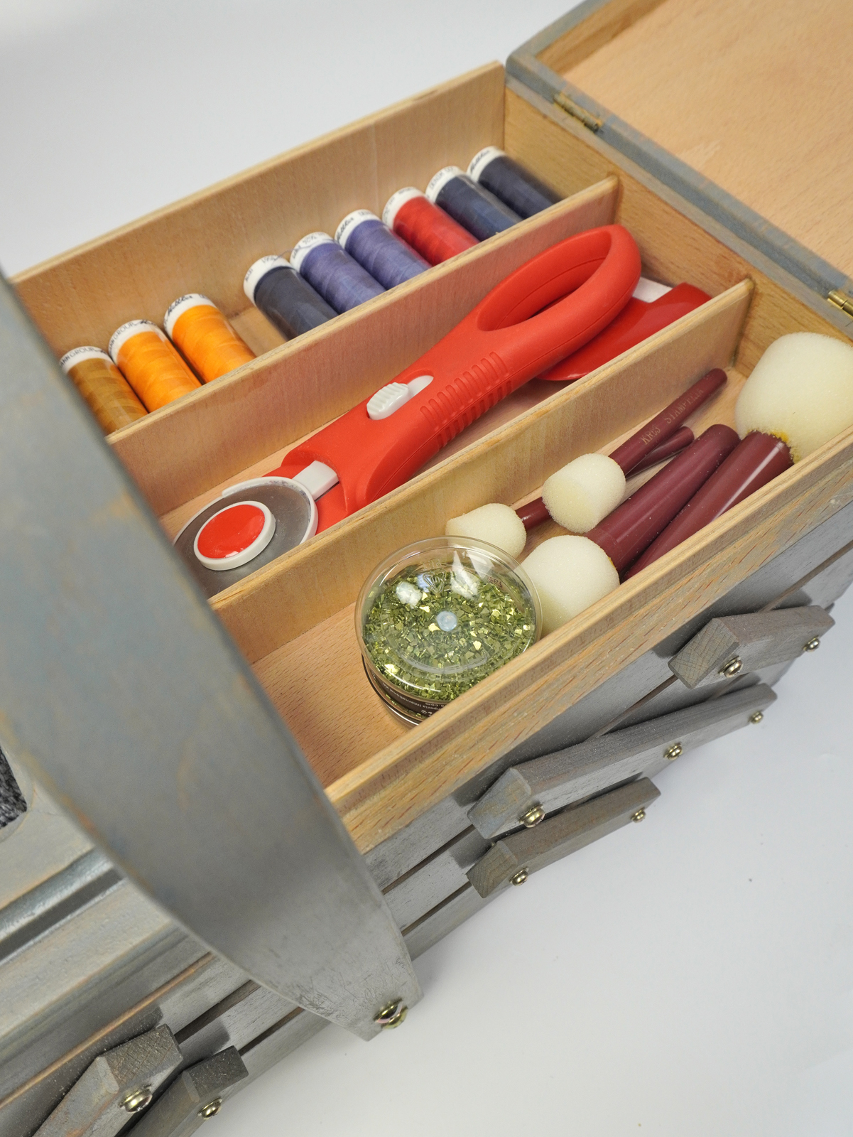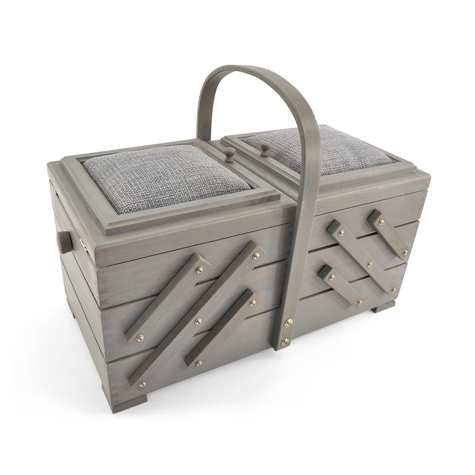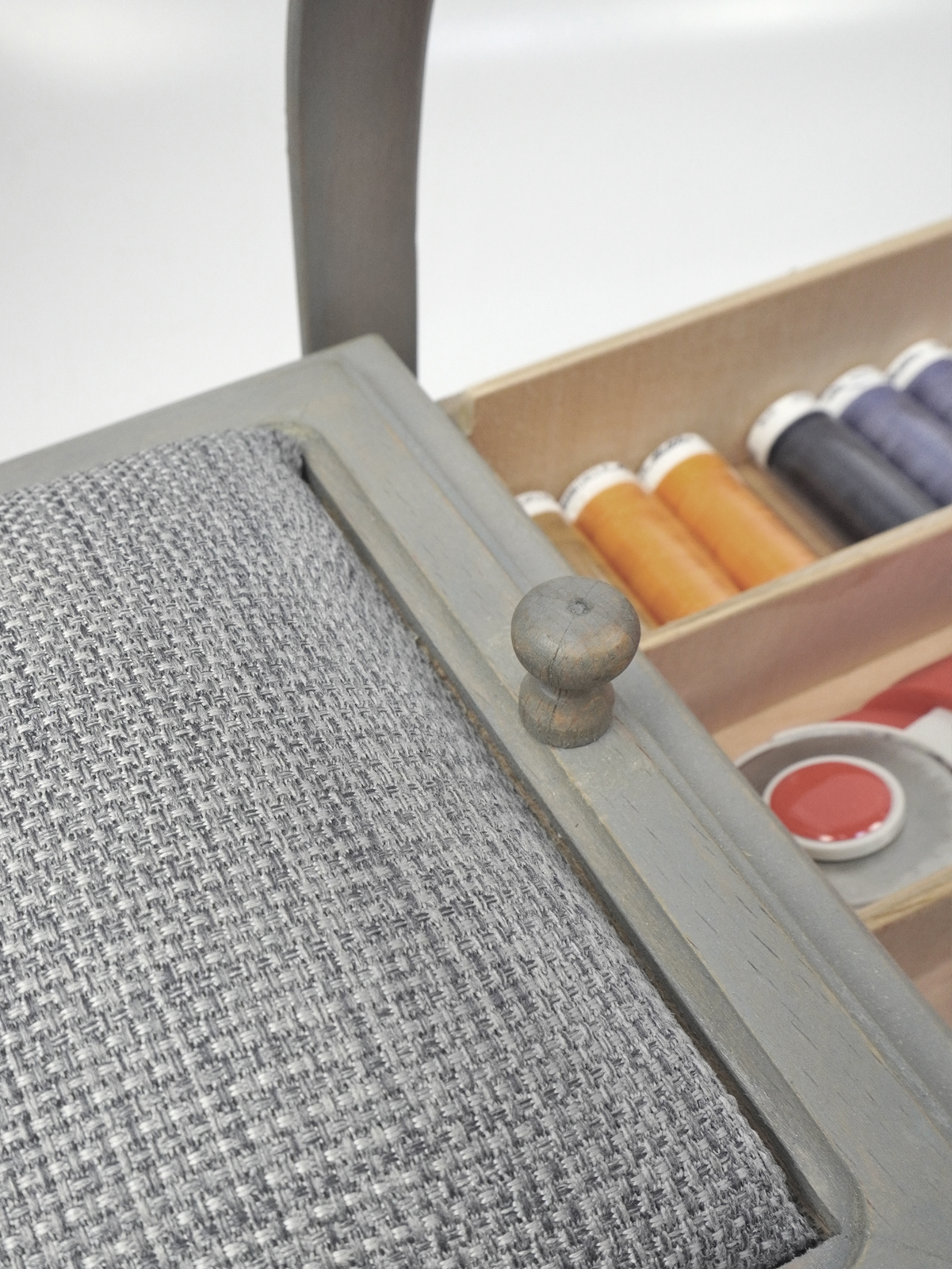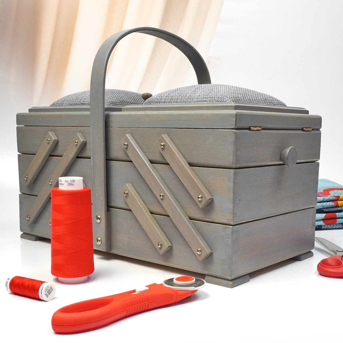 Шкатулка Aumüller предназначена для хранения фурнитуры и инструментов для шитья и рукоделия, которые всегда должны быть под рукой. Шкатулка изготовлена по немецкой технологии из прочной древесины бука, покрыта твёрдым воском с льняным тонированным маслом и акриловым лаком на водной основе. Данная модель выгодно отличается от аналогов своим более экологичным и креативным исполнением. Вместе с этим шкатулка сохранит эстетичный вид и прослужит максимально долгий срок службы. Шкатулка имеет трехъярусную консольную систему хранения. Два верхних яруса могут раскладываться в ширину, открывая удобный доступ ко всем отделениям. Верхние ячейки внутри имеют разделители для более мелкой фурнитуры, такой как катушки нитей, пуговицы, булавки. Крышки ячеек дополнены мягкими вставками, которые могут служить временными парковщиками игл и булавок. Ткань на вставках мягкая, дымчатого оттенка - под цвет шкатулки, и напоминает по виду клетчатую структуру канвы «аида». Шкатулка оснащена неподвижной, несъемной ручкой для переноски. Ярусы надежно соединены прочными винтами. Все внешние поверхности шкатулки обработаны 100% натуральным карнаубским воском в сочетании с пчелиным воском и льняным маслом, а также тонированы в серый винтажный оттенок. Вощение необходимо для предотвращения растрескивания древесины и защиты от влаги. Карнаубский воск производят из листьев карнаубской пальмы — «дерева жизни», растущей в Бразилии. Воск совершенно не токсичный и применяется в пищевой и медицинской промышленности, в косметике. Таким воском покрывают музыкальные струнные инструменты (скрипки Страдивари в XVII веке также покрывались карнаубским воском). Финальное покрытие шкатулки производится акриловым лаком для грязе- и водоотталкивающих свойств, а также защиты от воздействия высоких температур, ультрафиолетовых изучений, потемнения и грибковых поражений. Размеры шкатулки В32 х Ш44 х Г24 см, вес 3,5 кг. Это оптимальный размер и пространство для хранения различных инструментов, необходимых в творчестве. Расположить шкатулку можно на столе, тумбе, полке или в сочетании с мебельными элементами для частого использования мастерами. Увлекаясь рукоделием, используйте шкатулку Aumüller, чтобы держать швейные, вышивальные или вязальные принадлежности под рукой и всегда иметь опрятную рабочую поверхность. Буковое дерево и натуральная пропитка гарантирует экологичное встраивание в ваш творческий микроклимат комнаты. Бережное использование шкатулки гарантирует долгий срок службы, принося пользу и радость вам и вашим близким своим удобством и комфортом!