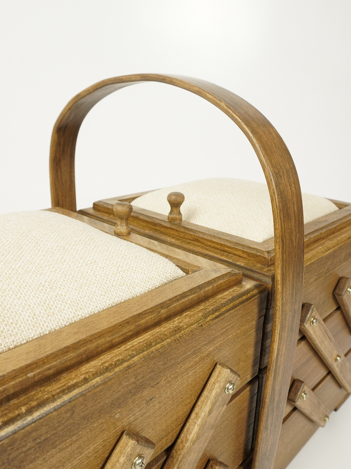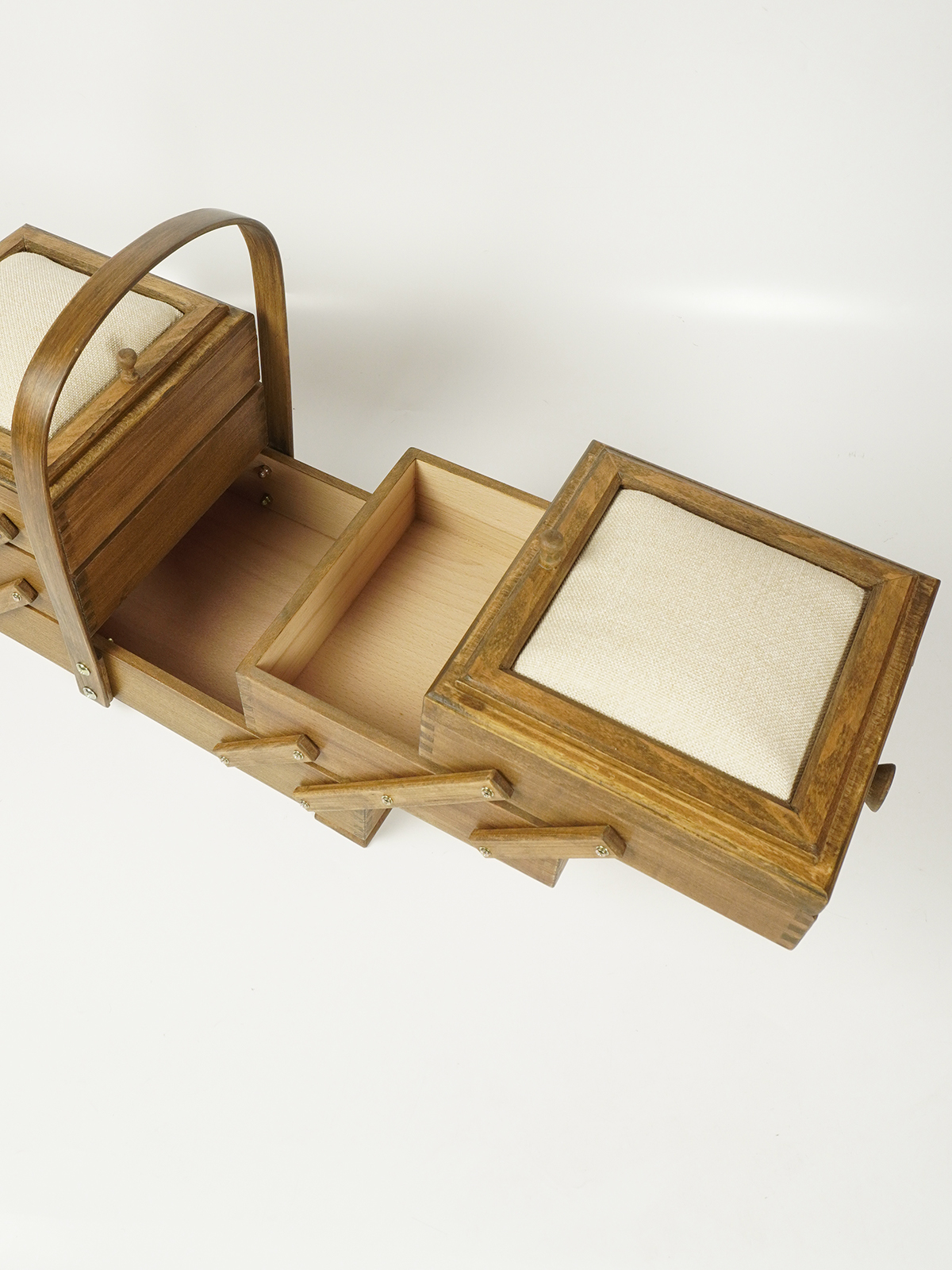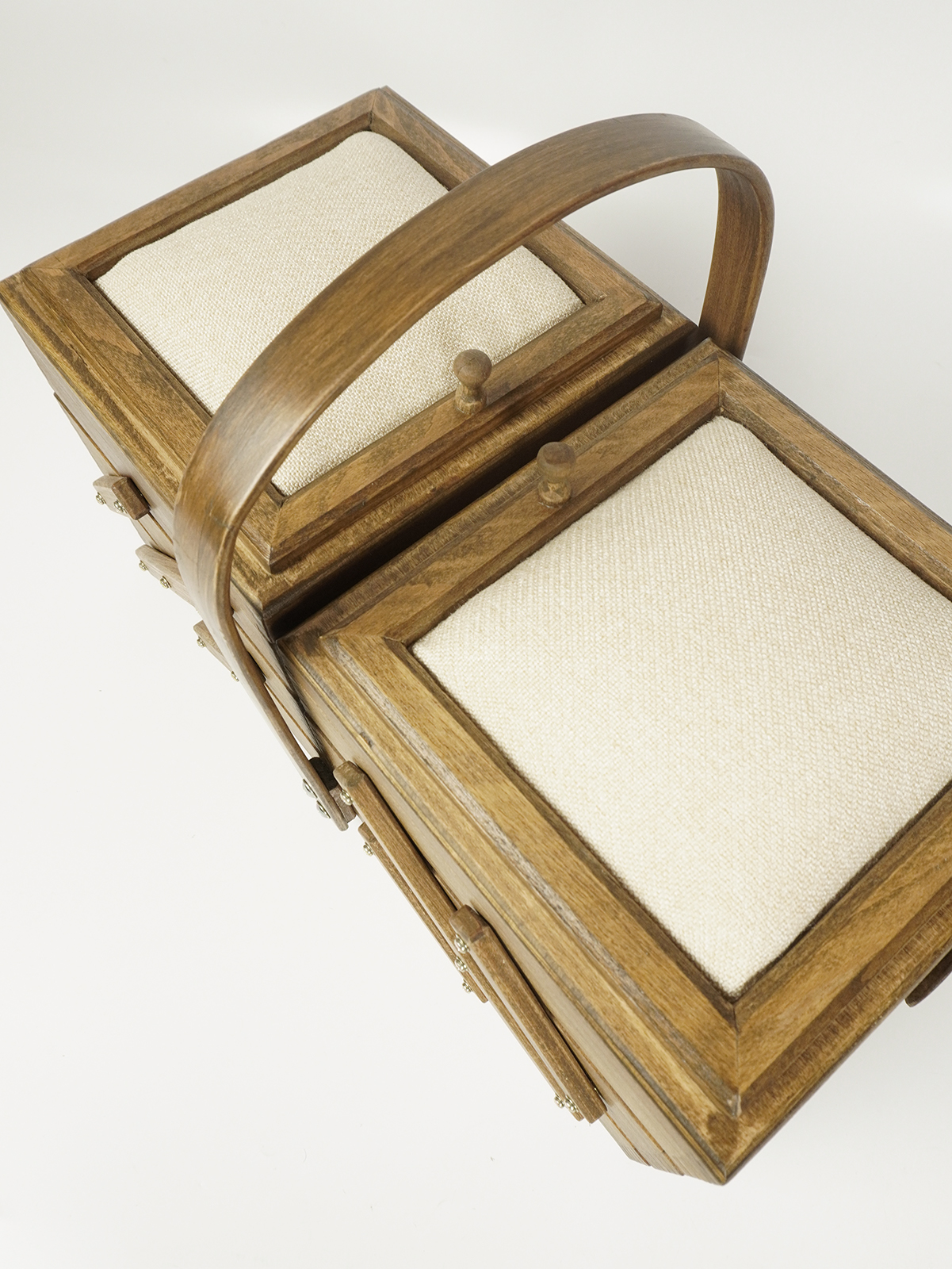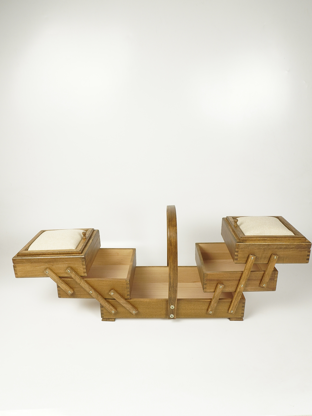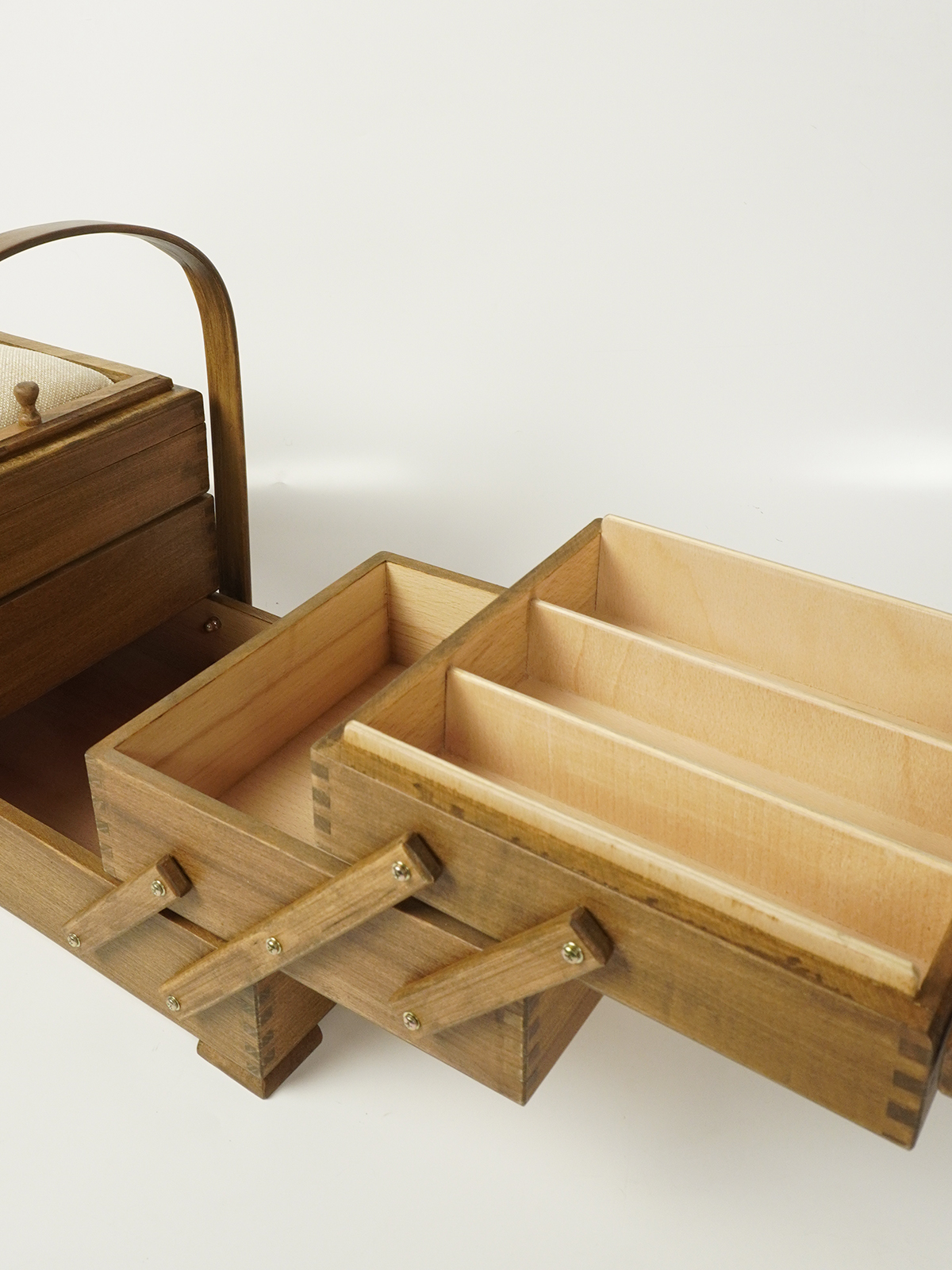 Шкатулка имеет трехъярусную консольную систему хранения. Два верхних яруса могут раскладываться в ширину, открывая удобный доступ ко всем отделениям. Верхние ячейки внутри имеют разделители для более мелкой фурнитуры, такой как катушки нитей, пуговицы, булавки.