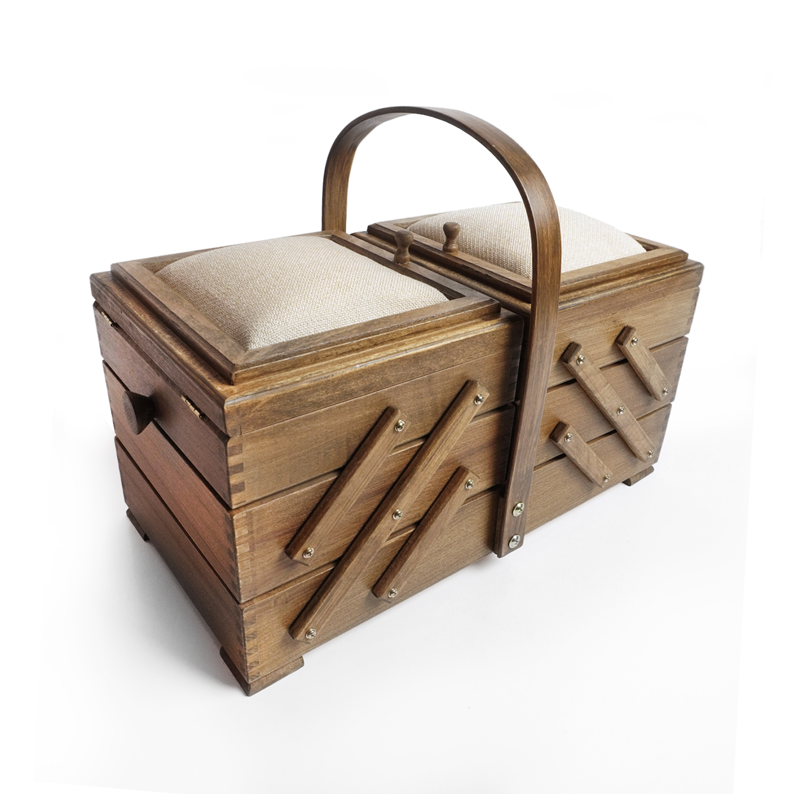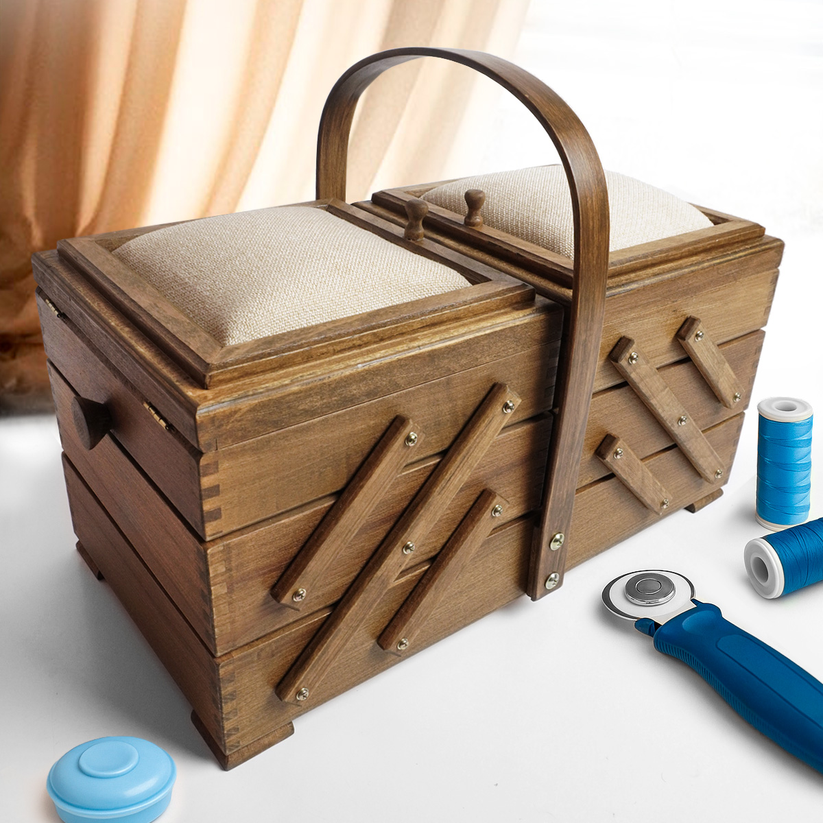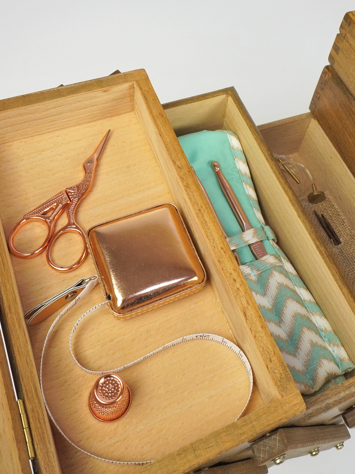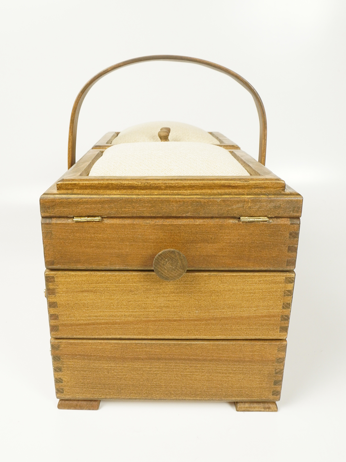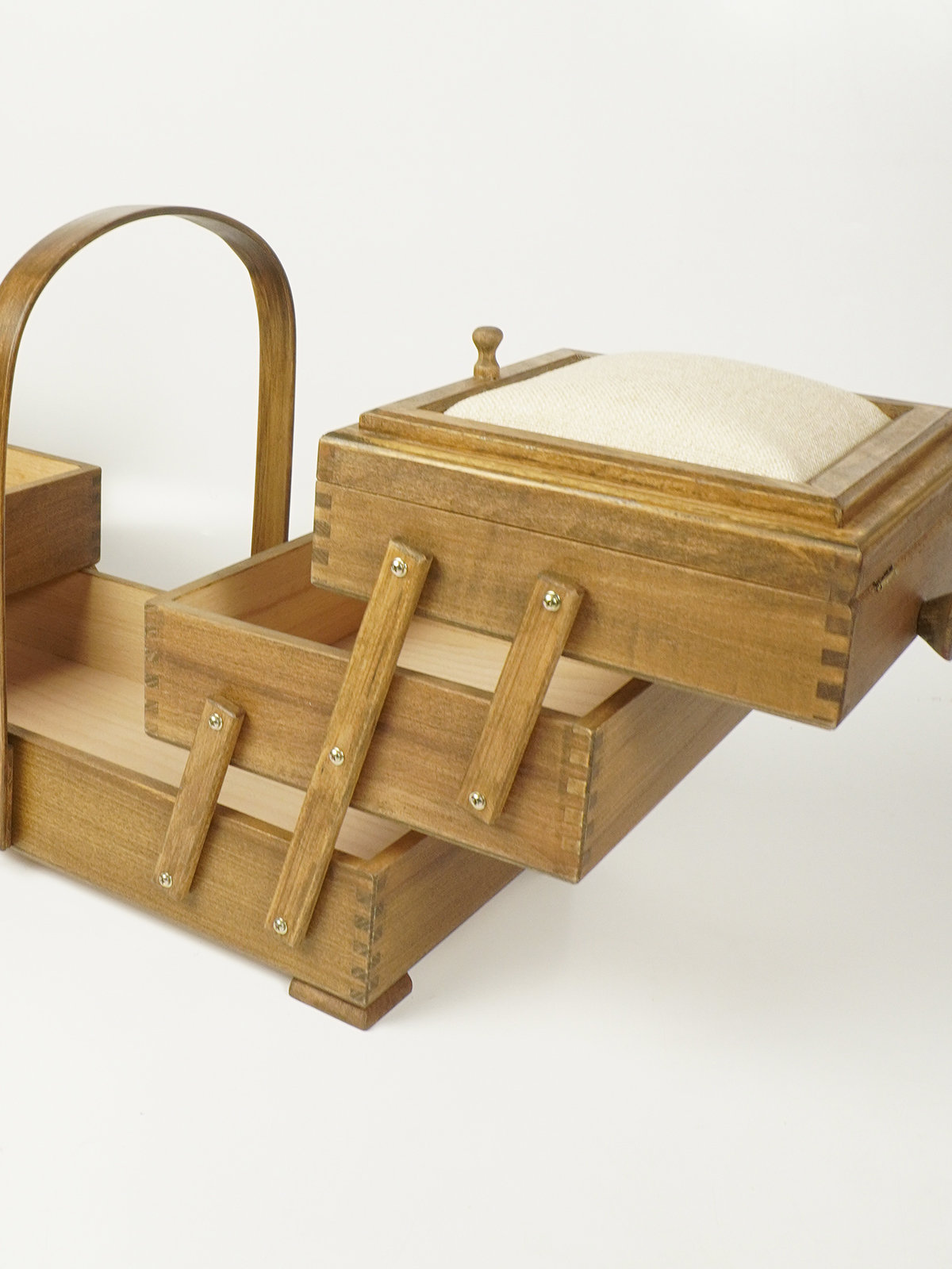 Шкатулка имеет трехъярусную консольную систему хранения. Два верхних яруса могут раскладываться в ширину, открывая удобный доступ ко всем отделениям. Верхние ячейки внутри имеют разделители для более мелкой фурнитуры, такой как катушки нитей, пуговицы, булавки.