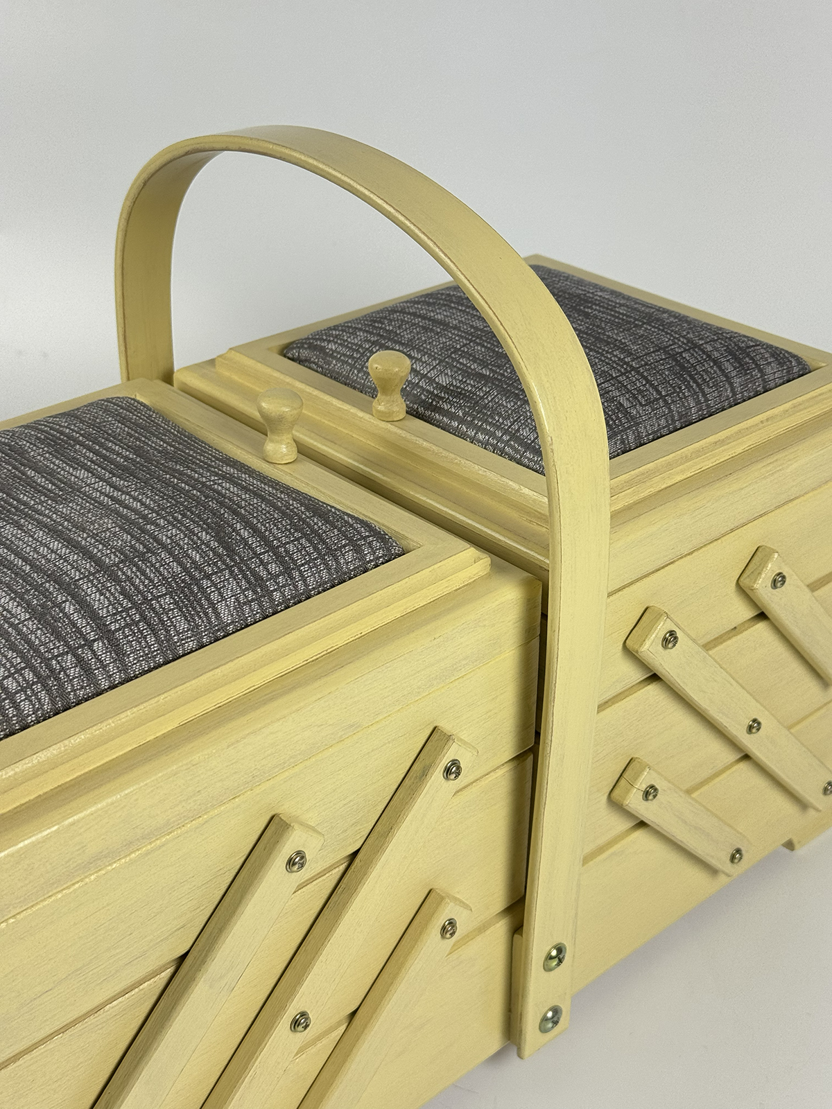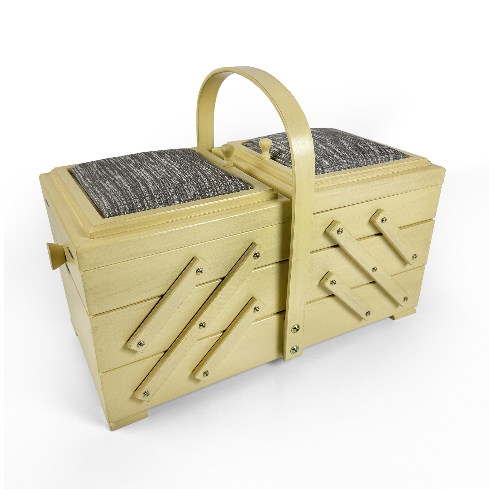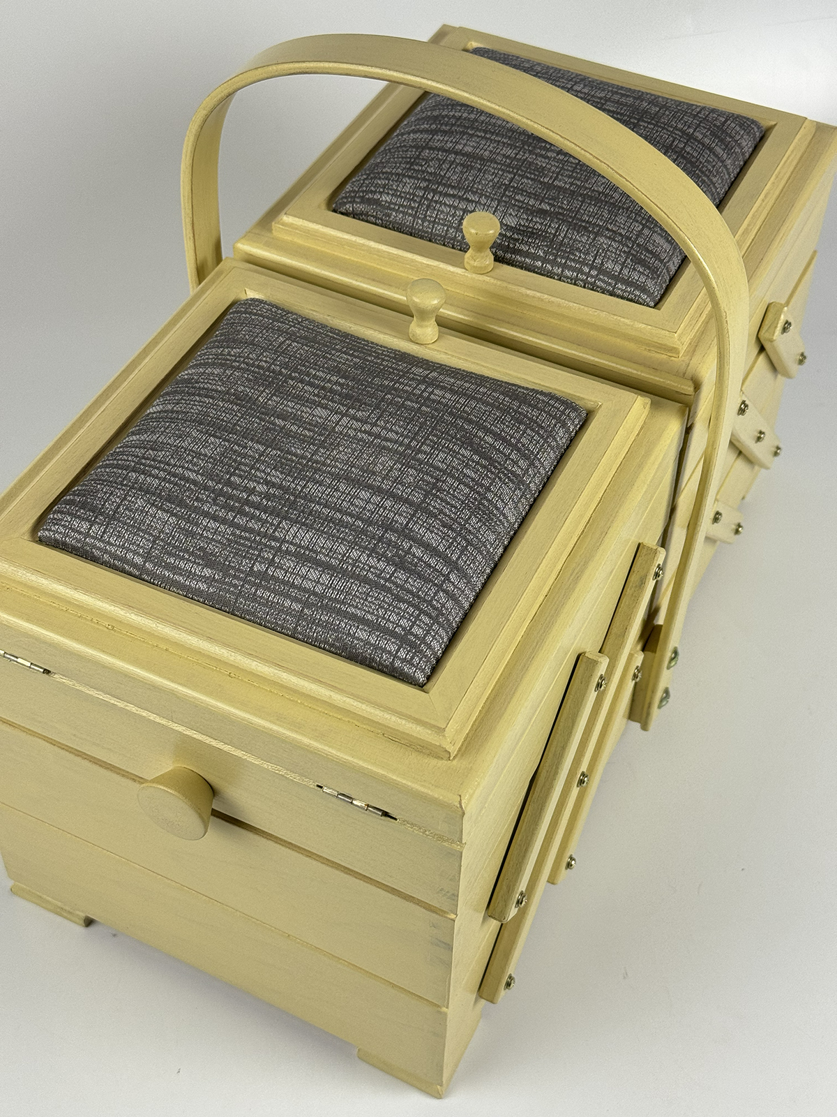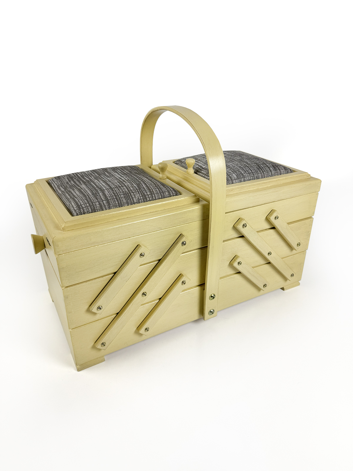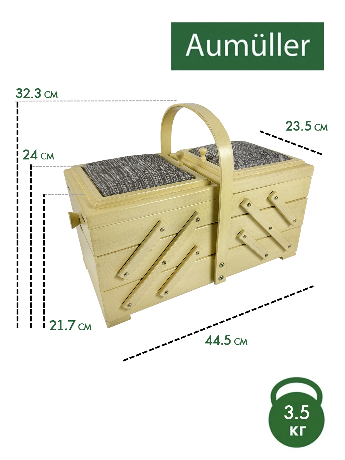 Шкатулка Aumüller предназначена для хранения фурнитуры и инструментов для шитья и рукоделия, которые всегда должны быть под рукой. Шкатулка изготовлена по немецкой технологии из прочной древесины бука, покрыта твёрдым воском с льняным тонированным маслом и акриловым лаком на водной основе. Данная модель выгодно отличается от аналогов своим более экологичным и креативным исполнением. Вместе с этим шкатулка сохранит эстетичный вид и прослужит максимально долгий срок службы. Шкатулка имеет трехъярусную консольную систему хранения. Два верхних яруса могут раскладываться в ширину, открывая удобный доступ ко всем отделениям. Верхние ячейки внутри имеют разделители для более мелкой фурнитуры, такой как катушки нитей, пуговицы, булавки. Крышки ячеек дополнены мягкими вставками, которые могут служить временными парковщиками игл и булавок. Шкатулка оснащена неподвижной, несъемной ручкой для переноски. Ярусы надежно соединены прочными винтами. Все внешние поверхности шкатулки обработаны 100% натуральным карнаубским воском в сочетании с пчелиным воском и льняным маслом. Вощение необходимо для предотвращения растрескивания древесины и защиты от влаги. Карнаубский воск производят из листьев карнаубской пальмы — «дерева жизни», растущей в Бразилии. Воск совершенно не токсичный и применяется в пищевой и медицинской промышленности, в косметике. Таким воском покрывают музыкальные струнные инструменты (скрипки Страдивари в XVII веке также покрывались карнаубским воском). Финальное покрытие шкатулки производится акриловым лаком для грязе- и водоотталкивающих свойств, а также защиты от воздействия высоких температур, ультрафиолетовых изучений, потемнения и грибковых поражений. Размеры шкатулки В32 х Ш44 х Г23 см, вес 3,5 кг. Это оптимальный размер и пространство для хранения различных инструментов, необходимых в творчестве. Расположить шкатулку можно на столе, тумбе, полке или в сочетании с мебельными элементами для частого использования мастерами. Увлекаясь рукоделием, используйте шкатулку Aumüller, чтобы держать швейные, вышивальные или вязальные принадлежности под рукой и всегда иметь опрятную рабочую поверхность. Буковое дерево и натуральная пропитка гарантирует экологичное встраивание в ваш творческий микроклимат комнаты. Бережное использование шкатулки гарантирует долгий срок службы, принося пользу и радость вам и вашим близким своим удобством и комфортом!
