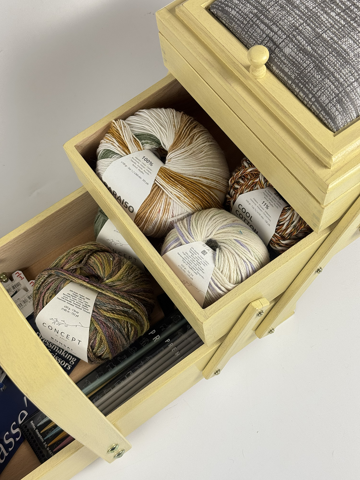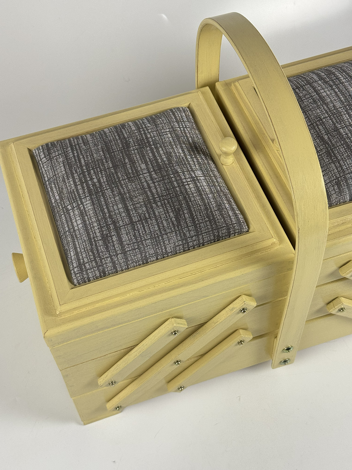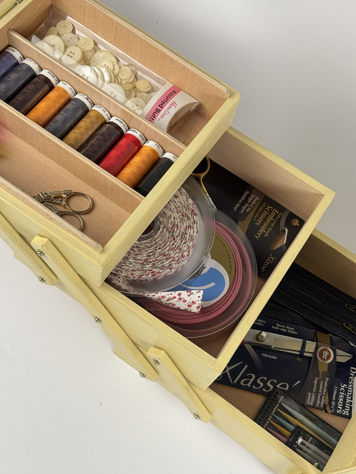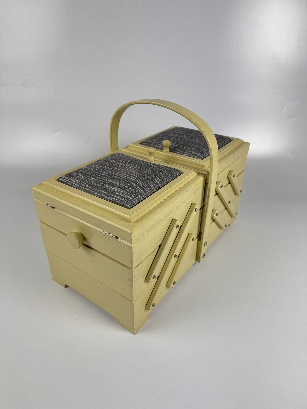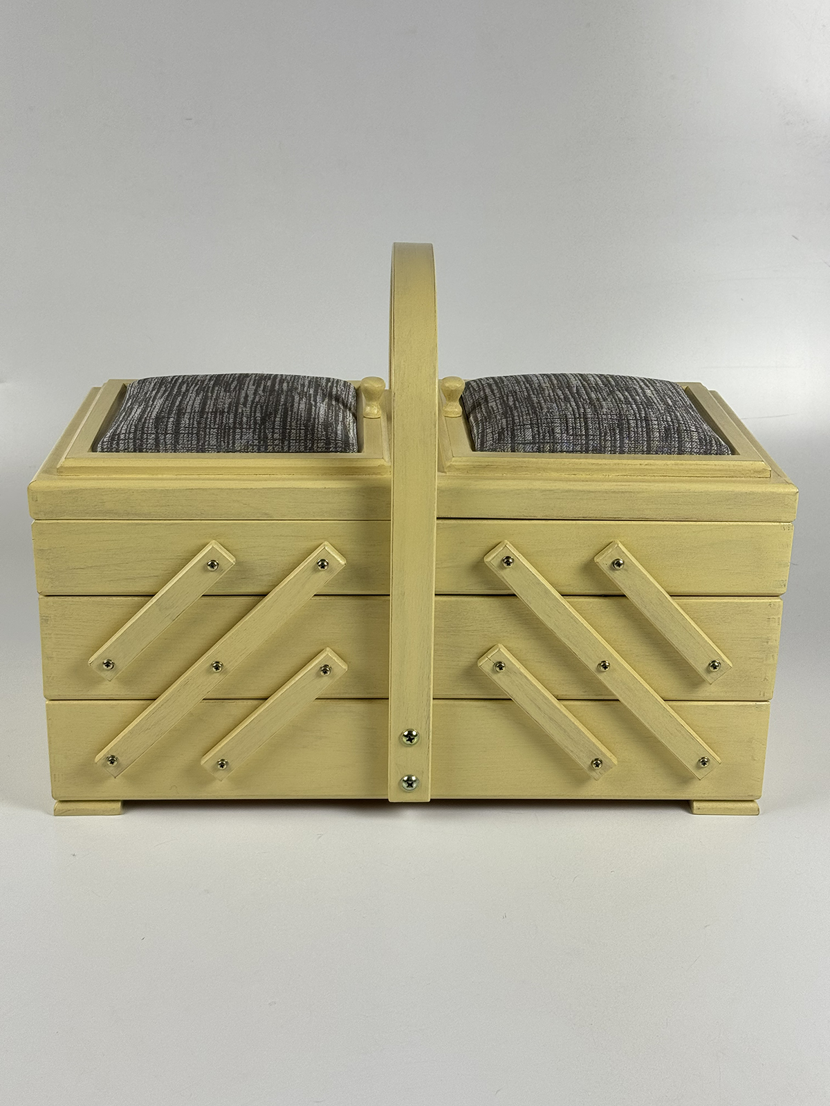 Шкатулка Aumüller предназначена для хранения фурнитуры и инструментов для шитья и рукоделия, которые всегда должны быть под рукой. Шкатулка изготовлена по немецкой технологии из прочной древесины бука, покрыта твёрдым воском с льняным тонированным маслом и акриловым лаком на водной основе. Данная модель выгодно отличается от аналогов своим более экологичным и креативным исполнением. Вместе с этим шкатулка сохранит эстетичный вид и прослужит максимально долгий срок службы. Шкатулка имеет трехъярусную консольную систему хранения. Два верхних яруса могут раскладываться в ширину, открывая удобный доступ ко всем отделениям. Верхние ячейки внутри имеют разделители для более мелкой фурнитуры, такой как катушки нитей, пуговицы, булавки. Крышки ячеек дополнены мягкими вставками, которые могут служить временными парковщиками игл и булавок. Шкатулка оснащена неподвижной, несъемной ручкой для переноски. Ярусы надежно соединены прочными винтами. Все внешние поверхности шкатулки обработаны 100% натуральным карнаубским воском в сочетании с пчелиным воском и льняным маслом. Вощение необходимо для предотвращения растрескивания древесины и защиты от влаги. Карнаубский воск производят из листьев карнаубской пальмы — «дерева жизни», растущей в Бразилии. Воск совершенно не токсичный и применяется в пищевой и медицинской промышленности, в косметике. Таким воском покрывают музыкальные струнные инструменты (скрипки Страдивари в XVII веке также покрывались карнаубским воском). Финальное покрытие шкатулки производится акриловым лаком для грязе- и водоотталкивающих свойств, а также защиты от воздействия высоких температур, ультрафиолетовых изучений, потемнения и грибковых поражений. Размеры шкатулки В32 х Ш44 х Г23 см, вес 3,5 кг. Это оптимальный размер и пространство для хранения различных инструментов, необходимых в творчестве. Расположить шкатулку можно на столе, тумбе, полке или в сочетании с мебельными элементами для частого использования мастерами. Увлекаясь рукоделием, используйте шкатулку Aumüller, чтобы держать швейные, вышивальные или вязальные принадлежности под рукой и всегда иметь опрятную рабочую поверхность. Буковое дерево и натуральная пропитка гарантирует экологичное встраивание в ваш творческий микроклимат комнаты. Бережное использование шкатулки гарантирует долгий срок службы, принося пользу и радость вам и вашим близким своим удобством и комфортом!