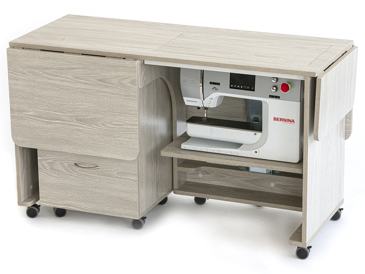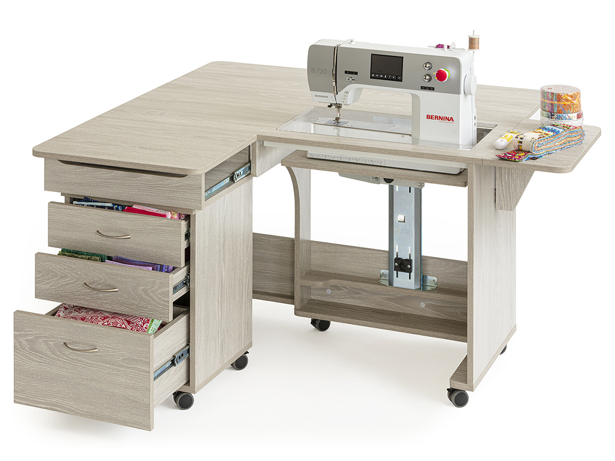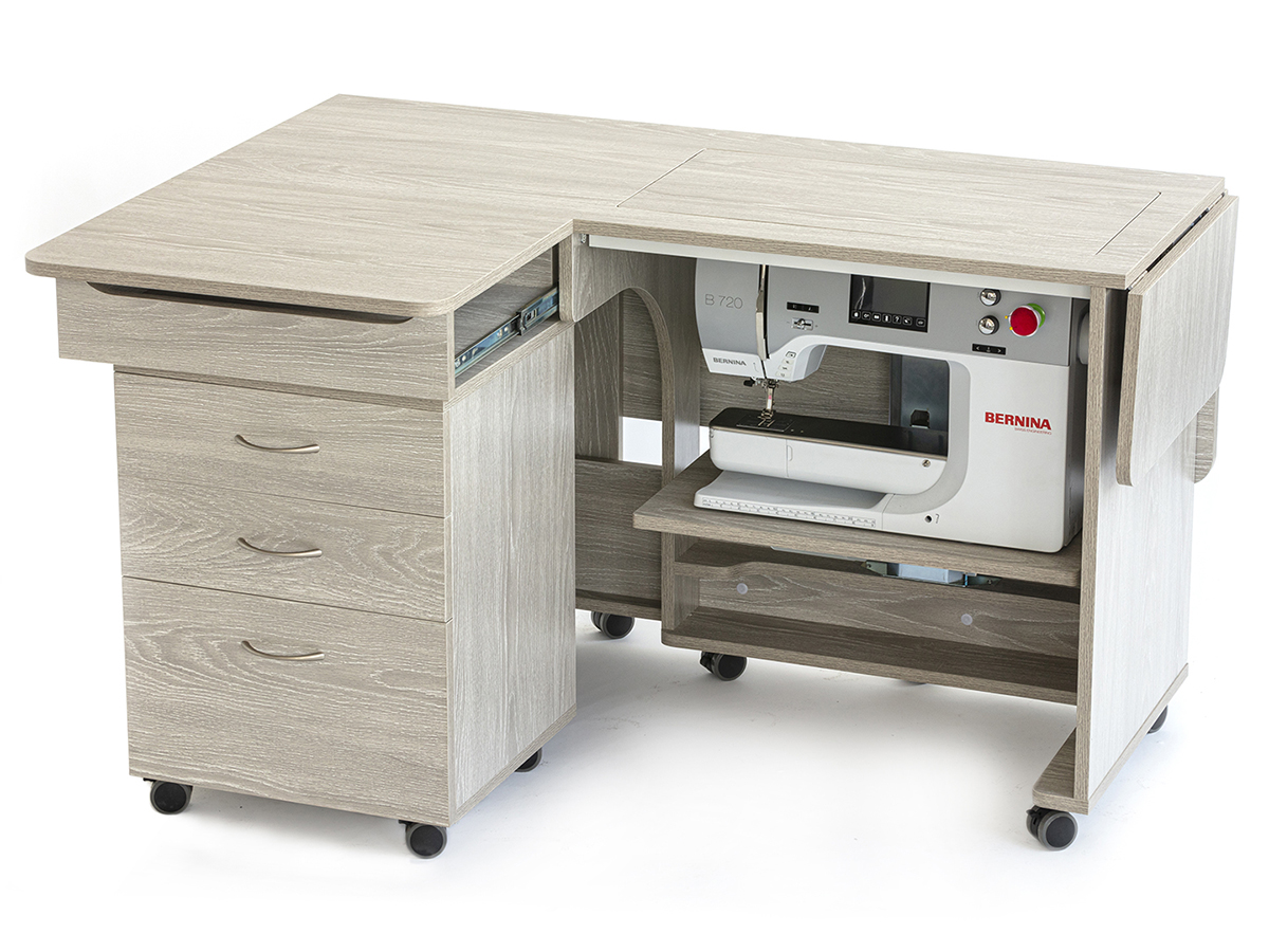 Стол для швейной машины с раскройным местом QUILTERS VISION. Компактный рабочий кабинет швеи. Это идеальное рабочее место для любого, кто занимается квилтингом на любом уровне профессионализма. Платформа под швейную машинку 615 х 320 мм, оснащена гидравлическим подъемником. Грузоподъемность 19 кг, 500 ньютонов. Удобная задняя раскладная панель для стежки, большой стол для раскроя ткани. Габариты в сложенном виде: 1420 х 515 х 760 мм. Габариты в разложенном виде: 1800 х 1390 х 760 мм. Гидравлический подъемник с тремя положениями фиксации, производство Германия. Все детали и соединительные элементы не торчат и находятся в единой плоскости со столом. Стол на колесиках, его удобно передвигать. Удобное пространство для ног.