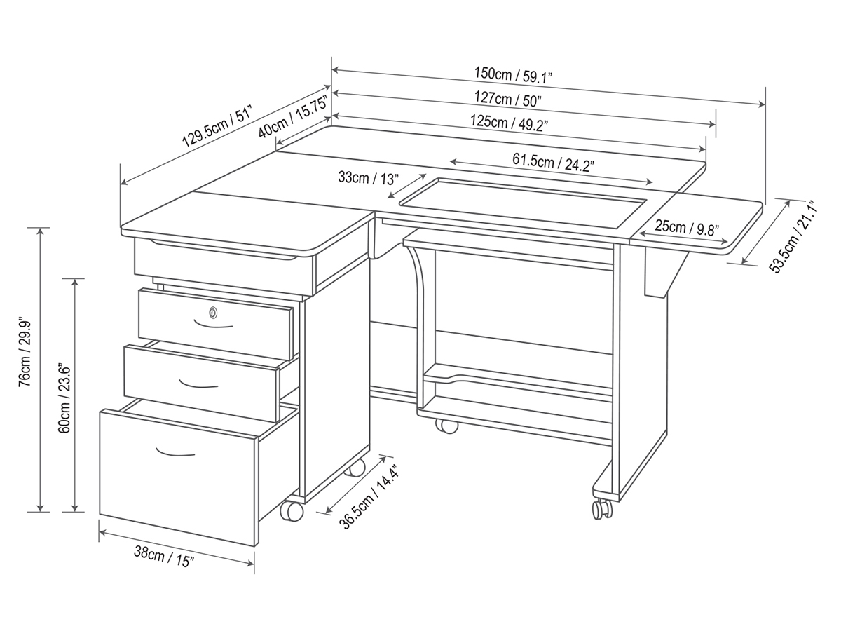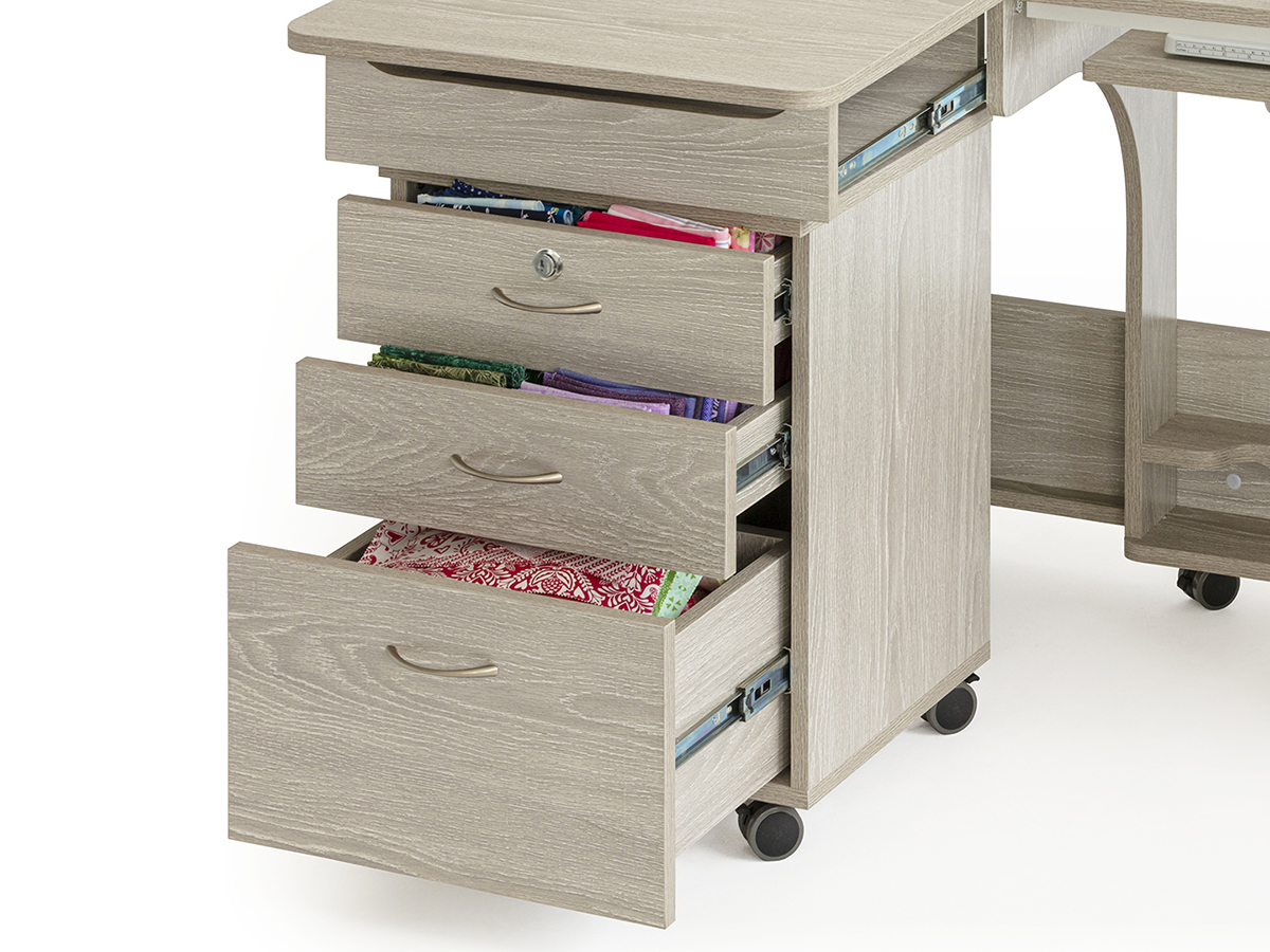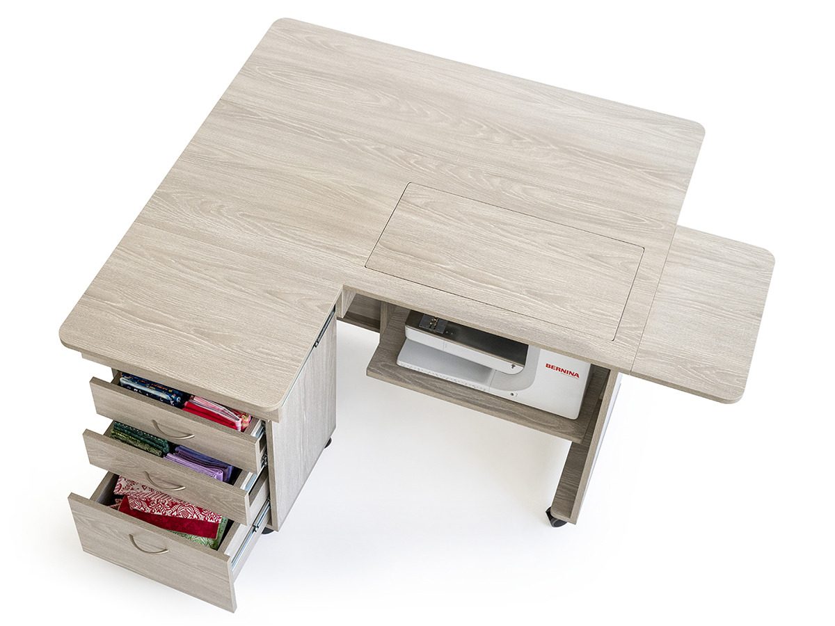 Стол для швейной машины с раскройным местом QUILTERS VISION. Компактный рабочий кабинет швеи. Это идеальное рабочее место для любого, кто занимается квилтингом на любом уровне профессионализма. Платформа под швейную машинку 615 х 320 мм, оснащена гидравлическим подъемником. Грузоподъемность 19 кг, 500 ньютонов. Удобная задняя раскладная панель для стежки, большой стол для раскроя ткани. Габариты в сложенном виде: 1420 х 515 х 760 мм. Габариты в разложенном виде: 1800 х 1390 х 760 мм. Гидравлический подъемник с тремя положениями фиксации, производство Германия. Все детали и соединительные элементы не торчат и находятся в единой плоскости со столом. Стол на колесиках, его удобно передвигать. Удобное пространство для ног.