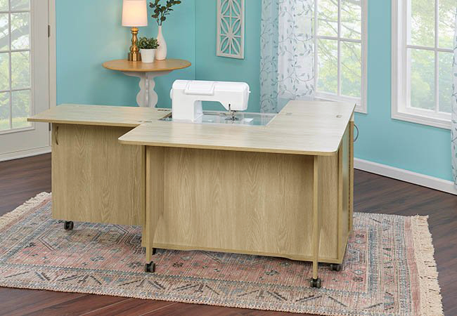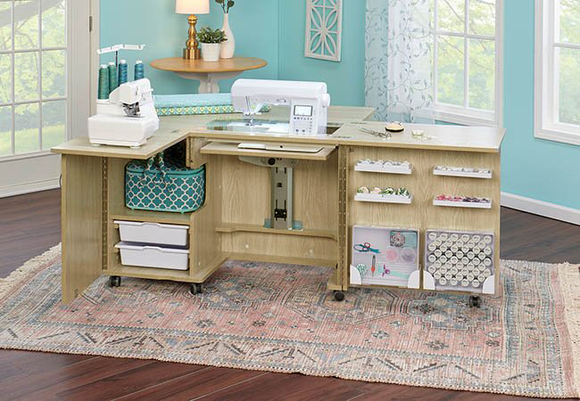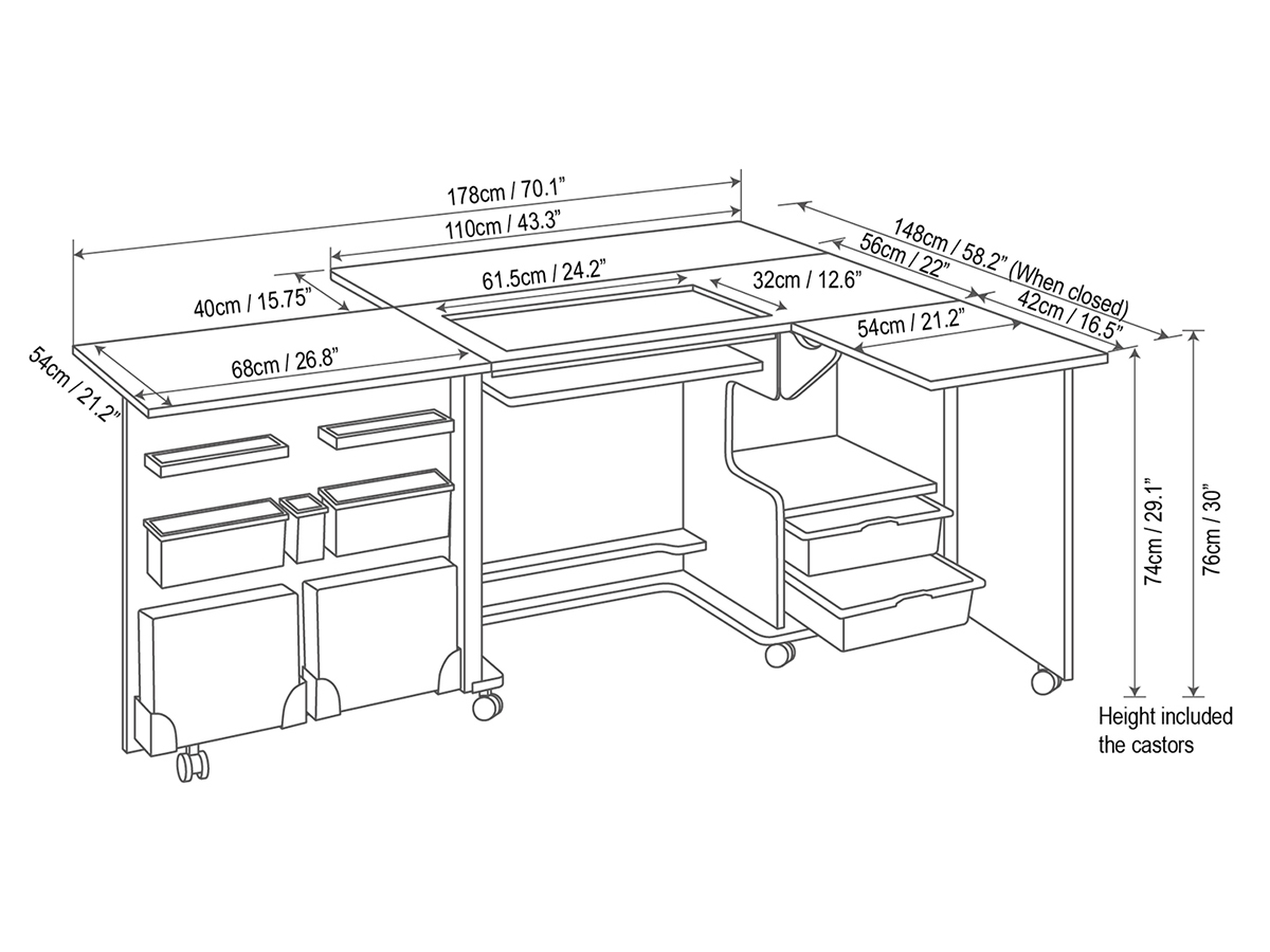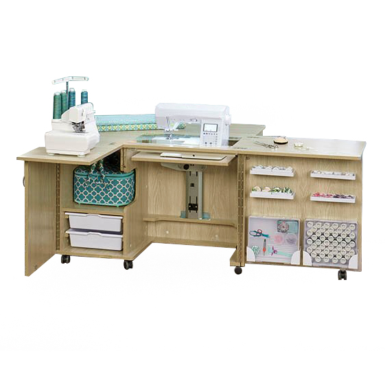 Стол для швейной машины с раскройным местом ECLIPSE. Компактный рабочий кабинет швеи. Особенность данной модели в том, что она сочетает в себе всё необходимое для полноценной работы на растоянии руки. Платформа под швейную машинку 615 х 320 мм, оснащена гидравлическим подъемником. Грузоподъемность 20 кг, 500 ньютонов. Возможность одновременной установки и хранения швейной машины и оверлока, большой стол для раскроя ткани. Габариты в сложенном виде: 1100 х 500 х 760 мм. Габариты в разложенном виде: 1780 х 1360 х 742 мм. Высота внутренней полки под оверлок 400 мм. Гидравлический подъемник с тремя положениями фиксации, производство Германия. Дополнительное оборудование: короб с держателями под катушки, большой органайзер для аксессуаров, 2 выдвижных пластиковых лотка, 4 съемные пластиковые полки для мелочей. Все детали и соединительные элементы не торчат и находятся в единой плоскости со столом. Стол на колесиках, его удобно передвигать. Удобное пространство для ног.