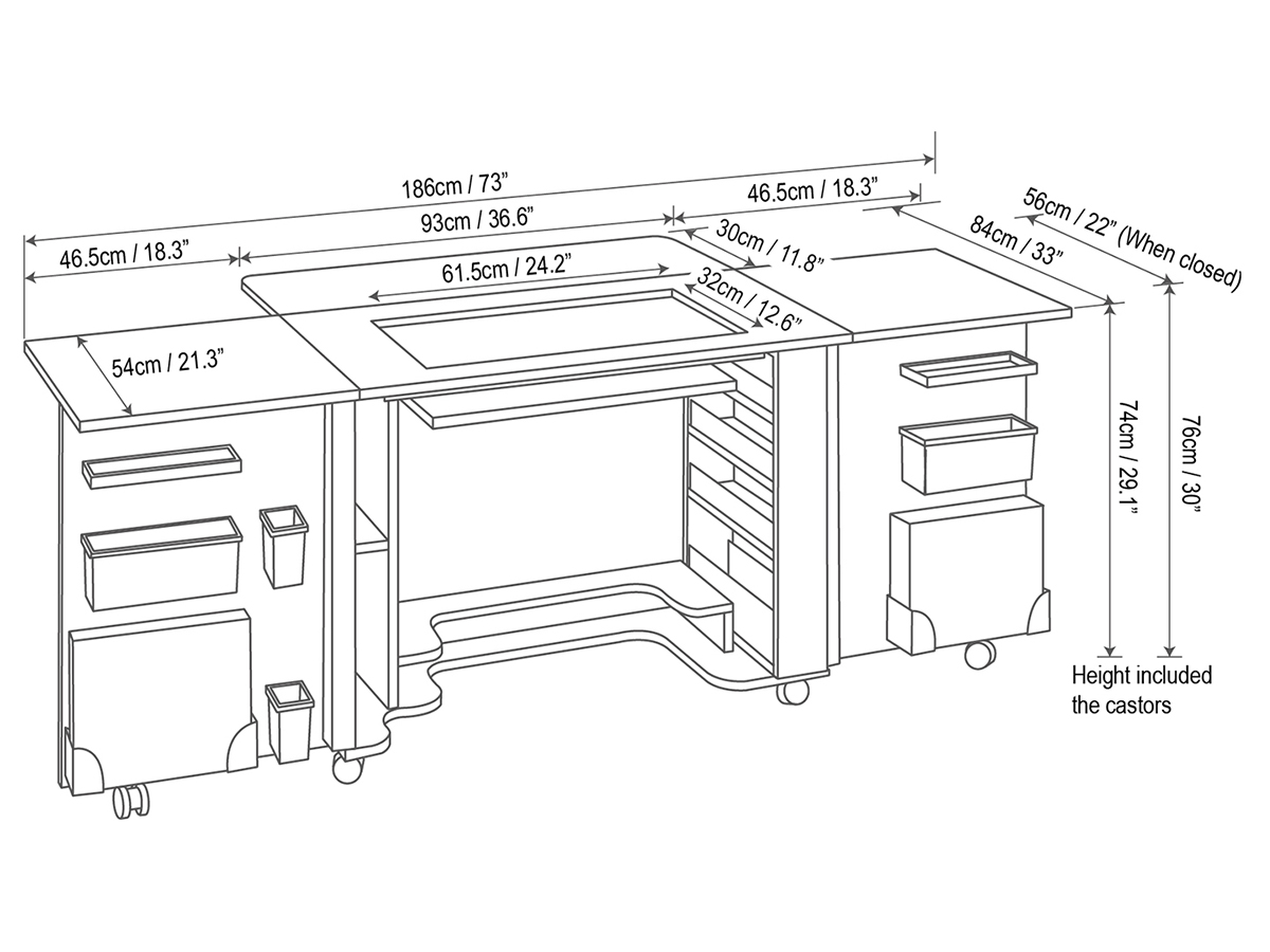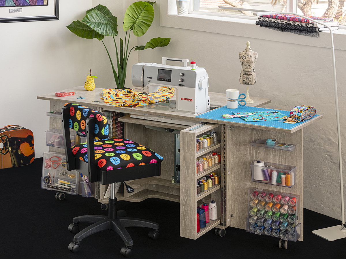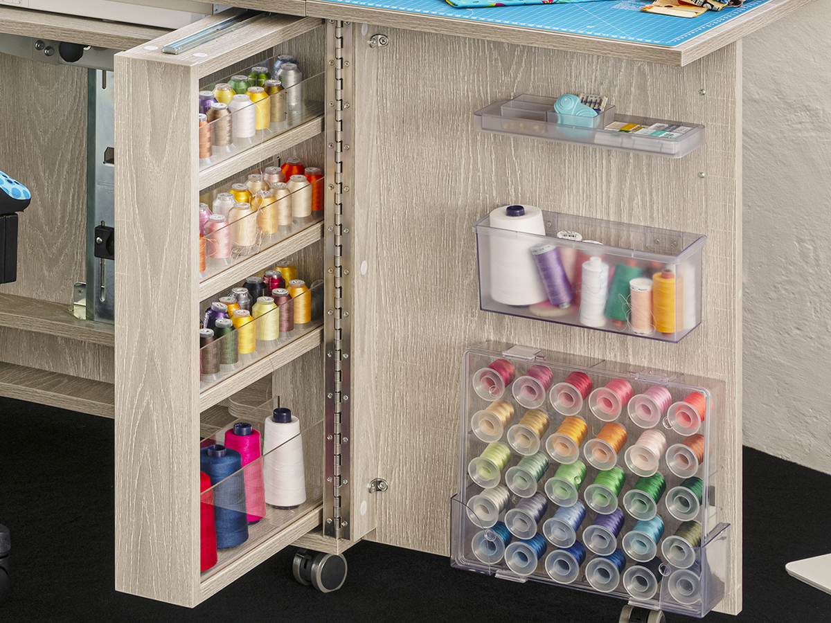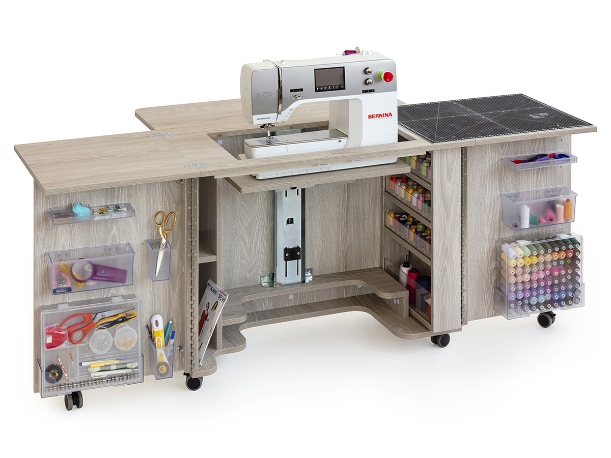 Стол раскладной для швейной машины с раскройным местом DUO. Компактный рабочий кабинет швеи. Особенность данной модели в том, что она сочетает в себе всё необходимое для полноценной работы на растоянии руки. Платформа под швейную машинку 615 х 320 мм, оснащена гидравлическим подъемником. Грузоподъемность 20 кг, 500 ньютонов. Возможность одновременной установки и хранения швейной машины и оверлока, большой стол для раскроя ткани. Габариты в сложенном виде: 940 х 500 х 760 мм. Габариты в разложенном виде: 1780 х 1360 х 742 мм. Высота внутренней полки под оверлок 400 мм. Гидравлический подъемник с тремя положениями фиксации, производство Германия. На все детали подъемника 2 года гарантии. Дополнительное оборудование: короб с держателями под катушки, большой органайзер для аксессуаров, 2 выдвижных пластиковых лотка, 4 съемные пластиковые полки для мелочей. Все детали и соединительные элементы не торчат и находятся в единой плоскости со столом. Стол на колесиках, его удобно передвигать. Удобное пространство для ног.