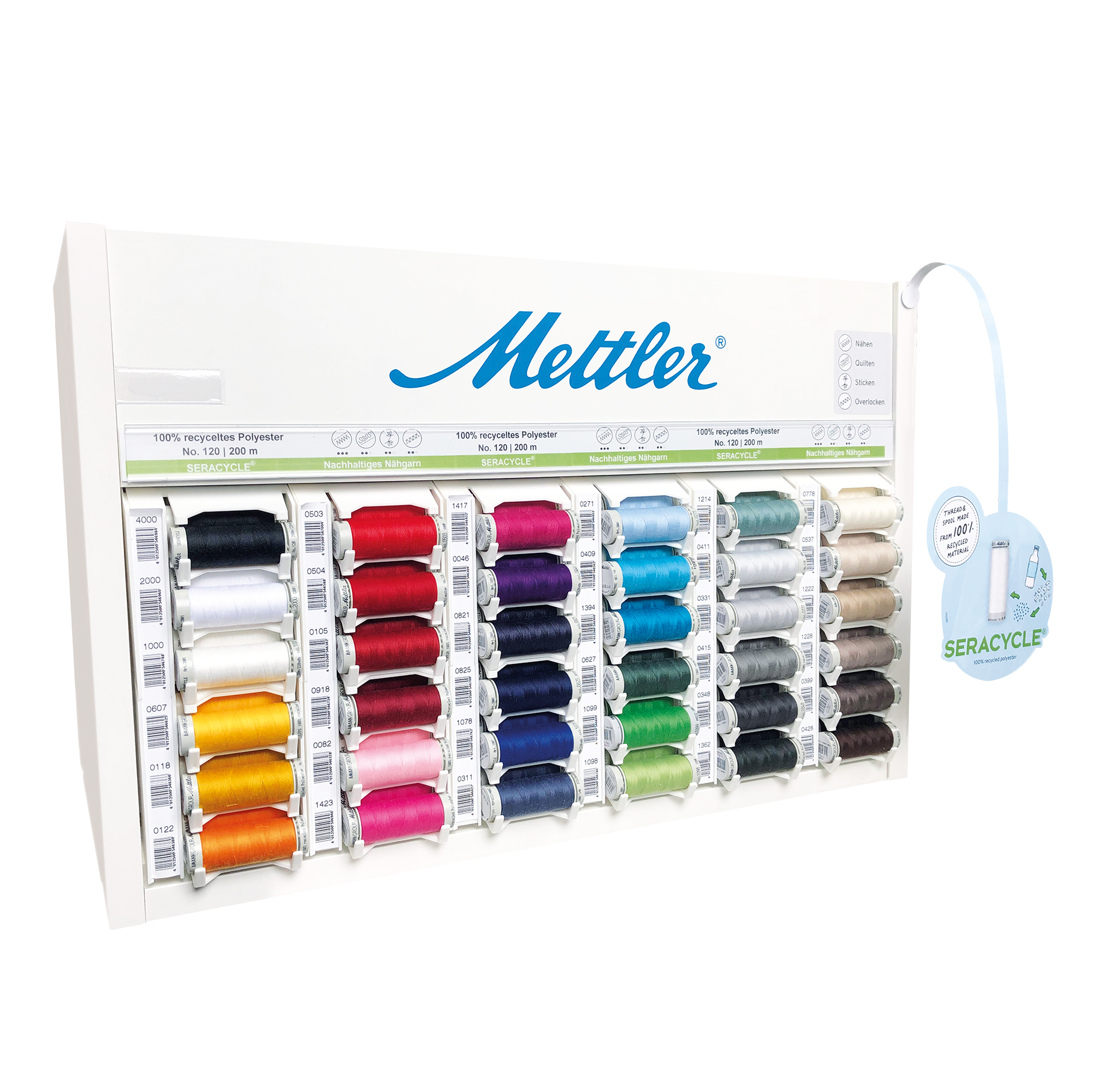 Изготовлен из 100% переработанных ПЭТ-бутылок. Для обеспечения высочайшего качества продукции обрабатываются только прозрачные ПЭТ-бутылки. Даже шпулька сделана из 100% переработанного полистирола (PS). Высококачественная универсальная нить для экономичных проектов по шитью тканей из хлопка, синтетики, смесовых тканей, льна и шелка. Мягкий внешний вид нити с отличным сопротивлением разрыву, истиранию и оптимальным удлинением. Стенд подобно конструктору легко подходит к любому оборудованию Mettler. Комплектация стенда по цветам предоставляется через вашего менеджера по запросу.
