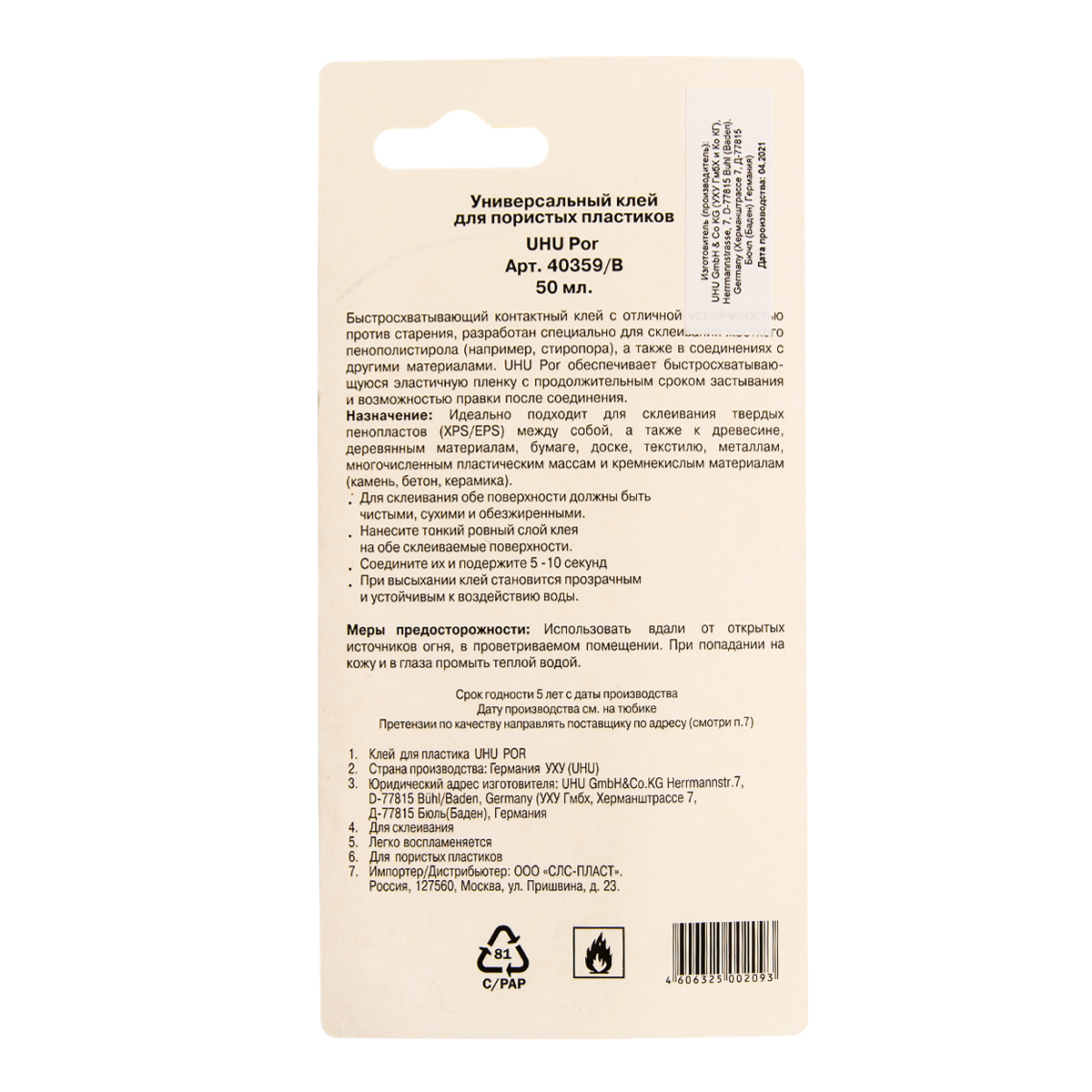 Контактный клей на основе искусственного каучука для склеивания разных сортов пенопласта (например стиропора), как между собой так и в сочетании с другими материалами (деревом, бумагой, текстилем, металлом, керамикой и др.). Идеально для склеивания цветных сортов бумаги со специальной пропиткой, а также фотобумаги.
