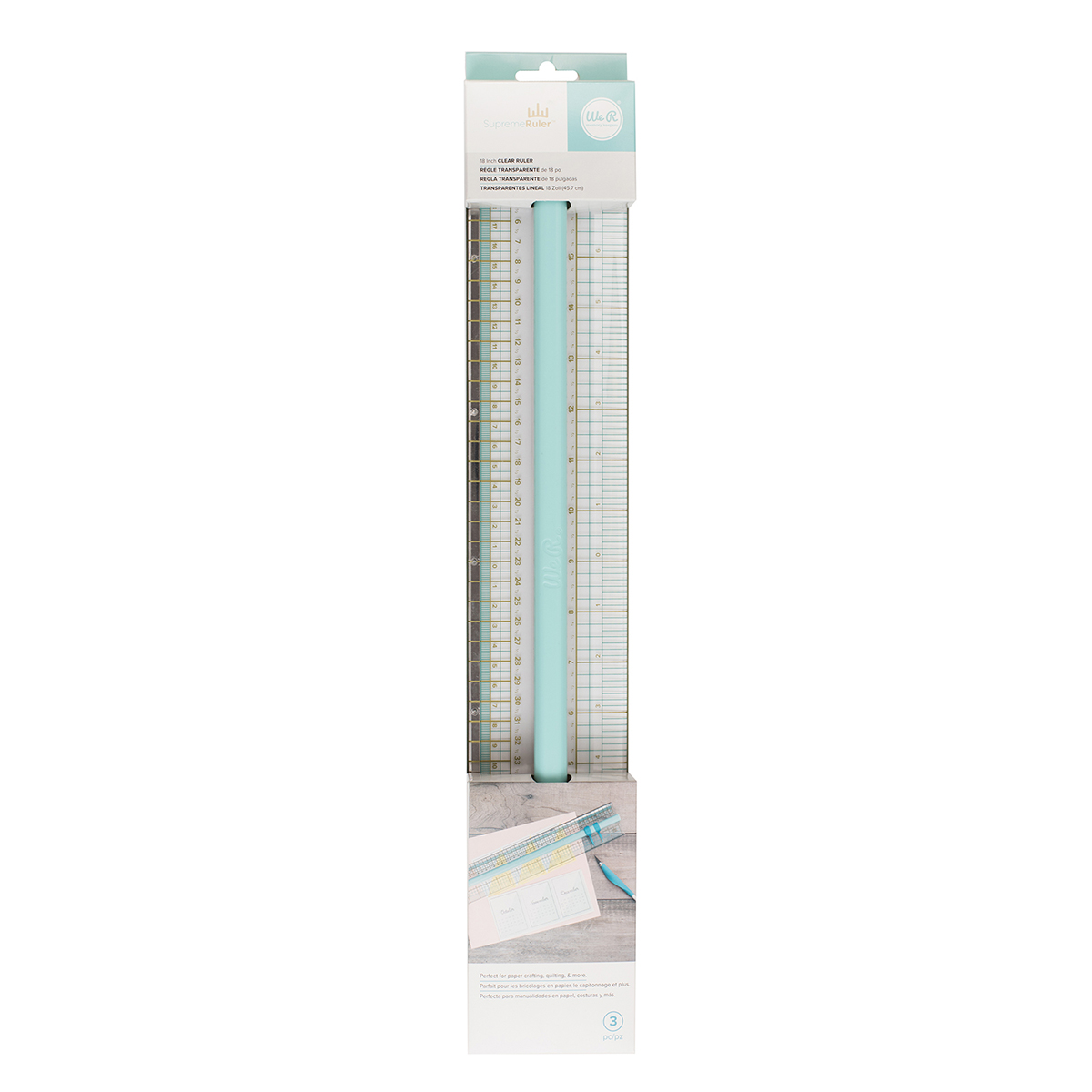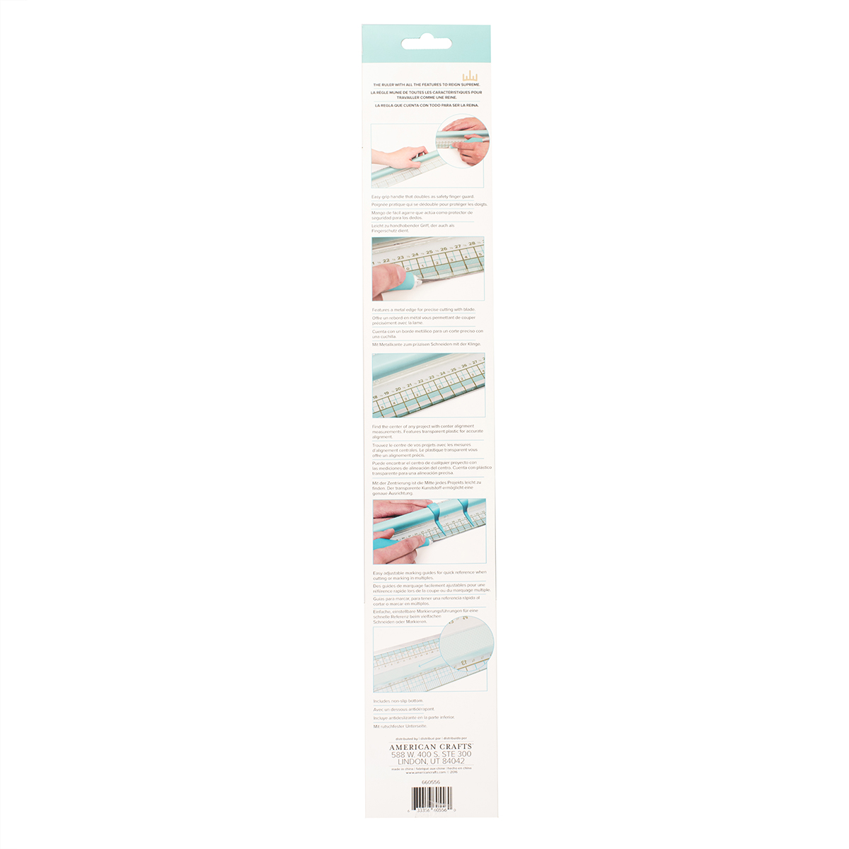 Линейка имеет удобную ручку по центру и нескользящее основание. Линейка имеет прочную металлическую кромку для резки с одной стороны. Держите за ручку линейку когда режете по кромке. Размеры указаны в дюймах и сантиметрах. Есть подвижные направляющие. Регулируемые направляющие идеально подходят для резки нескольких листов. Линейка размером 18 x 3.25 дюйма или 45.7 х 8.3 см.