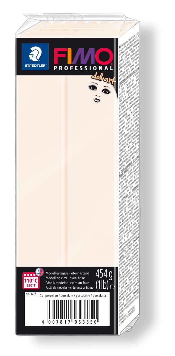 Полимерная глина FIMO professional doll art - это усовершенствованная FIMO Puppen. Полимерная глина была специально разработана и используется для лепки, а именно для создания кукол и скульптур. Натуральные цвета с эффектом полуматовой поверхности фарфора позволяют искусно проработанным лицам выглядеть живыми и очень выразительными. Полимерная глина выглядит и лепится как пластилин, но затвердевает и принимает законченный вид только после запекания в духовке при 110 °C около 30 минут. Его составляющие это - ПВХ и пластикосвязующее вещество.