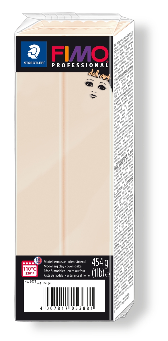 Полимерная глина FIMO professional doll art - это усовершенствованная FIMO Puppen. Полимерная глина была специально разработана и используется для лепки, а именно для создания кукол и скульптур. Натуральные цвета с эффектом полуматовой поверхности фарфора позволяют искусно проработанным лицам выглядеть живыми и очень выразительными. Полимерная глина выглядит и лепится как пластилин, но затвердевает и принимает законченный вид только после запекания в духовке при 110 °C около 30 минут. Его составляющие это - ПВХ и пластикосвязующее вещество.