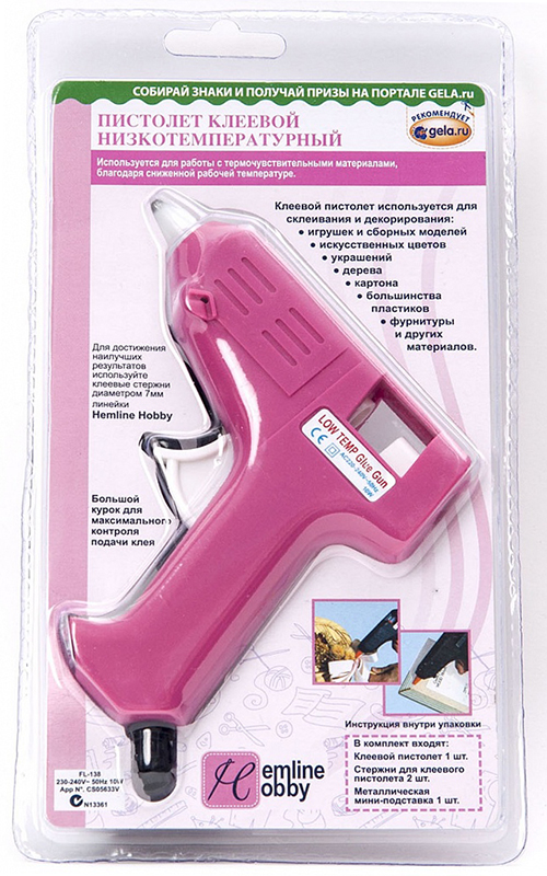 Пистолет используется для работы с термочувствительными материалами, благодаря сниженной рабочей температуре. С его помощью можно склеивать и декорировать: игрушки и сборные модели, искусственные цветы, украшения, дерево, картон, большинство пластиков, фурнитуру и другие материалы. Для достижения наилучших результатов используйте клеевые стержни диаметром 7 мм линейки Hemline Hobby. Курок на пистолете специально сделан большим для максимального контроля подачи клея.