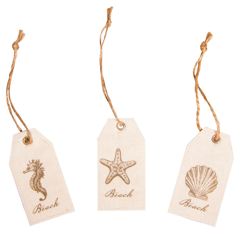 Текстильные тэги со штампингом RAYHER предназначаются для украшения композиций, аксессуаров и предметов в стиле "морское побережье". В наборе три тега: звезда, раковина, морской конек.