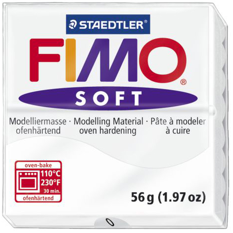 Полимерная глина FIMO Soft - это очень мягкая полимерная глина. Может быть использована для создания масштабных, тщательно детализированных объектов. Идеально подходит начинающим и профессионалам. Полимерная глина выглядит и лепится как пластилин, но затвердевает и принимает законченный вид только после запекания в духовке при 110 °C около 30 минут. Его составляющие это - ПВХ и пластикосвязующее вещество. Лепится легче, чем FIMO Professional.
