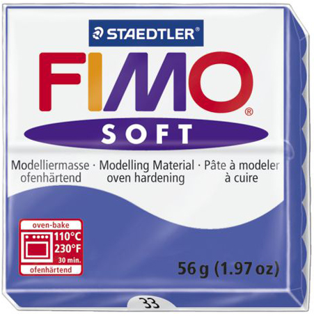 Полимерная глина FIMO Soft - это очень мягкая полимерная глина. Может быть использована для создания масштабных, тщательно детализированных объектов. Идеально подходит начинающим и профессионалам. Полимерная глина выглядит и лепится как пластилин, но затвердевает и принимает законченный вид только после запекания в духовке при 110 °C около 30 минут. Его составляющие это - ПВХ и пластикосвязующее вещество. Лепится легче, чем FIMO Professional.