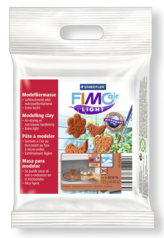 Полимерная глина FIMO "Air" - это запатентованная исключительно легкая глина для лепки, которая не только затвердевает на воздухе, но также может быть обожжена и в микроволновой печи в течение нескольких минут. Эта полимерная глина, из-за своей легкости, используется для лепки различных подвесок, елочных украшений, магнитов на холодильник, элементов декора, украшений для изделий при работе в технике скрапбукинг. Она идеально подходит для творчества в образовательных учреждениях: детских садах, школах и др. Рекомендуется использовать различные художественные формы для моделирования при работе с данной глиной. Полимерная глина выглядит и лепится как пластилин, затвердевает на воздухе в течение 24 часов или в течение 10 минут в микроволновой печи (600 W). После высыхания можно декорировать: склеивать, окрашивать, лакировать и т.д.