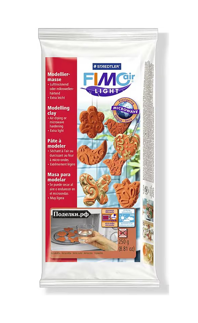 Полимерная глина FIMO "Air" - это запатентованная исключительно легкая глина для лепки, которая не только затвердевает на воздухе, но также может быть обожжена и в микроволновой печи в течение нескольких минут. Эта полимерная глина, из-за своей легкости, используется для лепки различных подвесок, елочных украшений, магнитов на холодильник, элементов декора, украшений для изделий при работе в технике скрапбукинг. Она идеально подходит для творчества в образовательных учреждениях: детских садах, школах и др. Рекомендуется использовать различные художественные формы для моделирования при работе с данной глиной. Полимерная глина выглядит и лепится как пластилин, затвердевает на воздухе в течение 24 часов или в течение 10 минут в микроволновой печи (600 W). После высыхания можно декорировать: склеивать, окрашивать, лакировать и т.д.