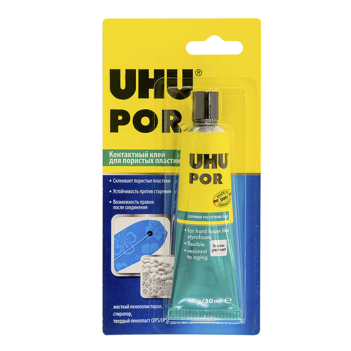 Контактный клей на основе искусственного каучука для склеивания разных сортов пенопласта (например стиропора), как между собой так и в сочетании с другими материалами (деревом, бумагой, текстилем, металлом, керамикой и др.). Идеально для склеивания цветных сортов бумаги со специальной пропиткой, а также фотобумаги.